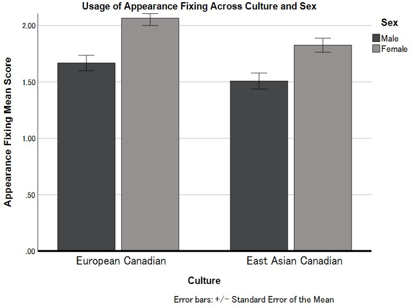 First, we conducted a 2 (Culture: European Canadian vs. East Asian Canadian) × 2 (Sex: Male vs. Female) ANOVA applying to Appearance Fixing. The results indicated that there was a main effect of Culture (Figure 1), indicating greater use of this strategy for European Canadians (M = 1.88, SD = 0.66) than East Asian Canadians (M = 1.69, SD = 0.56), F(1, 312) = 8.90, p = 0.003, = 0.028. We also found a main effect of Sex, indicating greater usage of this strategy amongst females (M = 1.94, SD = 0.58) than males (M = 1.59, SD = 0.62) F(1, 312) = 28.55, p < 0.001, = 0.085. The interaction effect between Culture and Sex for Appearance Fixing was not statistically significant, F(1, 312) = 0.36, p < 0.356, = 0.001.