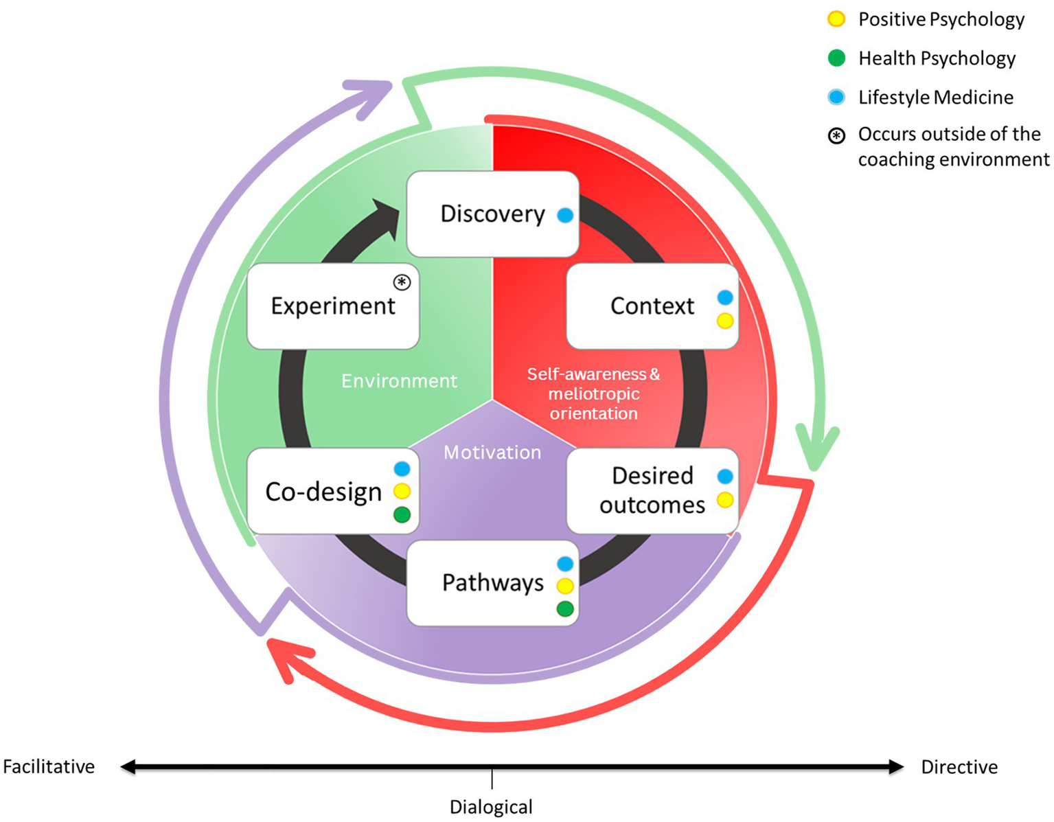 Positive health coaching conversational framework. This new PHC model is modified and adapted with permission from van Nieuwerburgh and Knight (2023), with consent from the authors. The PHC relationship between client and coach is structured around six dynamic, interlinked stages: discovery, context, desired outcomes, pathways, Co-design, and experiment. This conversational model is based on a foundation of three overarching determinants of health and wellbeing that influence the process: self-awareness and meliotropic orientation (red), motivation (purple), and environment that includes elements of the social, systemic, and natural worlds (green). The color-coded dots represent the theoretical and evidence-based pathways that can be used to support the client along their coaching journey: positive psychology (yellow), health psychology (green), and lifestyle medicine (blue). The cyclical flow reflects a continuous, client-led process of reflection, action, and adaptation in pursuit of health and wellbeing.