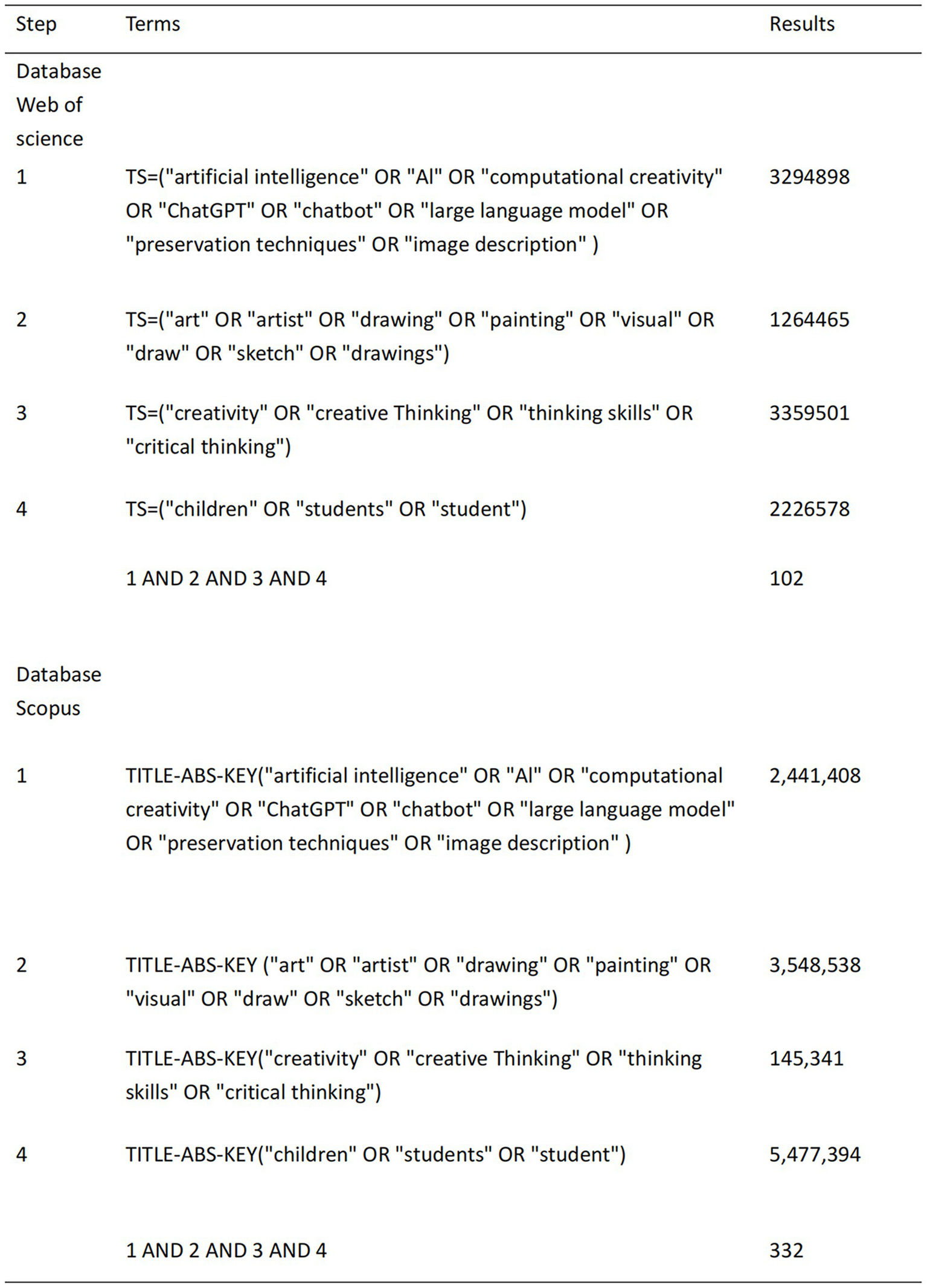 A systematic literature search was conducted on December 5th, 2024, across two major electronic databases: Scopus and Web of Science Core Collection. The search strategy was developed iteratively through pilot searches and by reviewing search strategies used in previous relevant systematic reviews (Ardoin and Bowers, 2020; Oksanen et al., 2023; Samaniego et al., 2024). The final search query combined keywords and index terms related to three core concepts: (1) “artificial intelligence” OR “machine learning” OR “deep learning” OR “computer vision”; (2) “painting” OR “drawing” OR “art creation” OR “visual art”; (3) “child” OR “adolescent” OR “youth” OR “student.” Boolean operators (“OR” within concepts, “AND” between concepts) were applied to refine the search. The complete search syntax for each database, including all field codes and search parameters, is documented in Figure 2. No date or language restrictions were applied during the initial search to maximize retrieval.