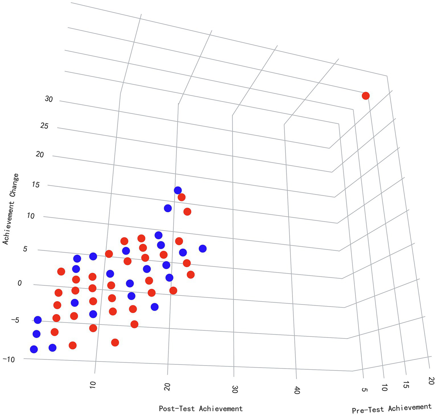 While gender was not a primary variable of interest in the initial research design, preliminary analyses revealed notable gender-related trends. Given the theoretical relevance of gender in mindset and self-efficacy research, we included these findings to provide a more comprehensive understanding of the intervention’s impact. As Figure 2 shows, the 3D scatter plot visualizes the relationship between Pre-Test Achievement, Post-Test Achievement, and Achievement Change (calculated as the difference between post-test and pre-test scores), with points differentiated by gender (blue for males, red for females). The axes of the plot are as follows: the X-axis represents Pre-Test Achievement, measured in z-scores, the Y-axis represents Post-Test Achievement, also in z-scores, and the Z-axis represents Achievement Change (Δ = Y – X). The encoding used for the plot includes color to represent gender, with blue indicating male participants and red indicating female participants. Additionally, the plane (z = 0) distinguishes between Achievement Change greater than 0 (Δ > 0), indicating improvement, and Achievement Change less than 0 (Δ < 0), indicating decline. An interactive 3D version of this plot is available in Supplementary material S3. Male students exhibit consistent gains in achievement, with their data points clustering above the z = 0 plane (Δ = +12.3, SD = 4.1; 95% CI [10.8, 13.8]), suggesting more uniform improvements. This pattern may reflect stable self-efficacy (e.g., task-specific confidence) and mathematical mindset (e.g., persistence in problem-solving). In contrast, female students show greater variability in achievement change, with their data points spread both above and below the plane. This variability (Δ range: −8.2 to +15.7; 17% below z = 0) suggests that gendered stereotypes may undermine the stability of self-efficacy and mathematical mindset, in line with previous research (e.g., Cort et al., 2020). Additionally, lower pre-test achievers (on the left side of the X-axis) demonstrated larger growth in achievement (Δ = +18.5 ± 9.2), suggesting that the intervention may be particularly beneficial for disadvantaged learners. However, the high variability (SD > 9) signals that contextual barriers, such as stereotype threat (Steele, 1997), could also play a role in moderating the effects of the intervention. On the other hand, higher pre-test achievers (on the right side of the X-axis) generally showed smaller changes, possibly due to a ceiling effect in their performance. Finally, a gender-by-baseline achievement interaction (β = −0.37, p < 0.001, hierarchical regression) further revealed polarized outcomes among low-achieving females, indicating that the intersection of gender and baseline achievement could influence the intervention’s impact (Figure 2).