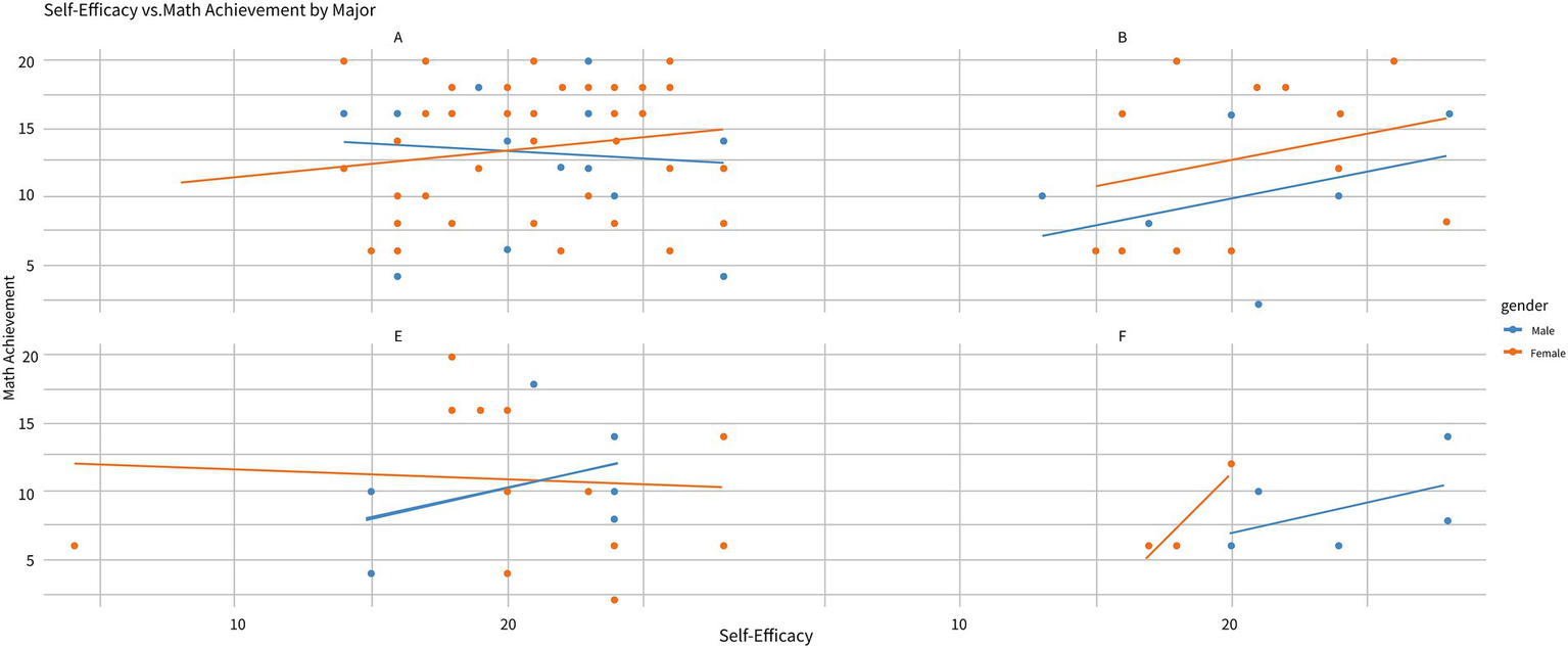 The plot illustrates how the relationship between Self-Efficacy (SE) and Math Achievement varies by academic major and gender (see Figure 1). Majors are labeled as follows: A (Arts), B (Business), E (Economics), and T (Technology). In Major A, female students exhibit a stronger positive correlation between SE and Math Achievement (β = 0.62, p < 0.001), as indicated by the steeper slope of the orange line compared to males (β = 0.38, p = 0.012). This suggests that SE plays a more significant role in driving female achievement in highly applied, team-based disciplines (Smith et al., 2020). In contrast, male students show a weaker relationship between SE and achievement in this major. Similarly, in Major B, the relationship between SE and Math Achievement is stronger for female students, with a steeper positive slope (β = 0.55, p = 0.003), while male students again demonstrate a more moderate connection (β = 0.41, p = 0.015). However, in Major E, both male and female students show a much weaker relationship between SE and achievement (β < 0.10, p > 0.05), with near-horizontal lines indicating minimal impact of SE on Math Achievement. In Major T, male students have a stronger positive relationship between SE and Math Achievement (β = 0.58, p = 0.007), as shown by the steeper slope of the blue line, suggesting that males in this major are more reliant on SE for improving their achievement. Conversely, female students in Major T display a much weaker relationship (β = 0.22, p = 0.092), indicating that their achievement is less influenced by SE. These findings highlight that the impact of SE on Math Achievement is context-dependent, varying by both academic major and gender. SE’s role in shaping achievement varies not only by gender but also by disciplinary environment (Figure 3).