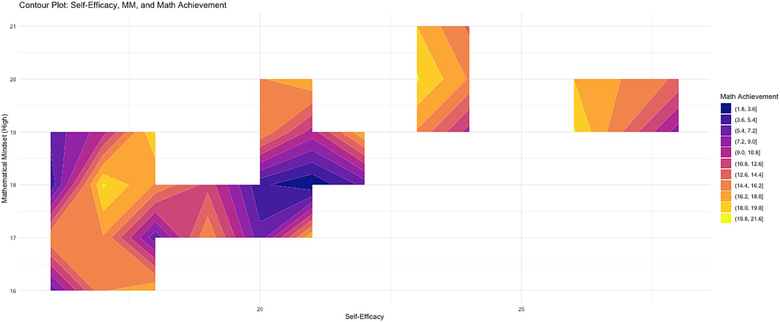 Contour Plot (SE, MM, Achievement) visualizes the joint distribution of Self-Efficacy (SE), Mathematical Mindset (MM), and Math Achievement, with color gradients indicating achievement levels—darker colors corresponding to lower achievement and lighter colors to higher achievement (see Figure 2). Key observations show that high levels of both MM (particularly above the midpoint) and SE (≥20) are associated with the highest achievement, as represented by the yellow region. In contrast, low SE (≤15) and low MM (≤17) correspond to the darkest areas, indicating the lowest achievement. Moderate levels of SE and MM, shown in the orange transition zone, suggest that both factors need to be elevated simultaneously to maximize achievement. The contour plot highlights that the joint enhancement of SE and MM has a nonlinear, synergistic effect on achievement, while isolated interventions in either SE or MM show limited impact. Overall, the plot emphasizes the importance of simultaneously improving both SE and MM for optimal math performance, as their combined influence significantly enhances achievement (Figure 4).