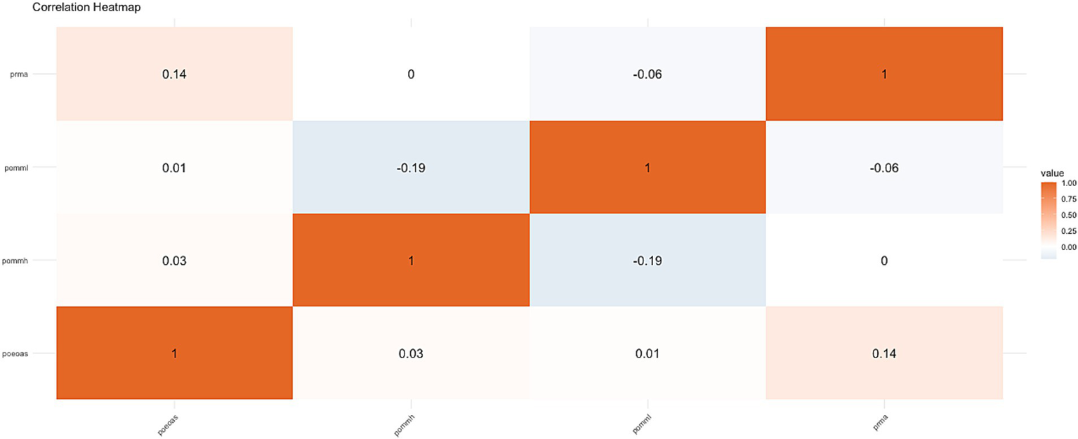 Despite SE’s contextual importance, the correlation heatmap (Figure 3) cautions against overestimating its direct effects. Both SE and MM exhibit only weak correlations with achievement, implying their contributions are mediated by indirect pathways. The Correlation Heatmap above displays the pairwise correlations among four variables: prma (Mathematical Achievement), pommh (Mathematical Mindset with higher scores indicating a better mindset), pomml (Mathematical Mindset with lower scores indicating a better mindset), and poeas (Self-Efficacy). The heatmap uses color intensity to indicate the strength and direction of these relationships, with values ranging from 0 to 1. Key observations reveal that Self-Efficacy (poeas) and Mathematical Achievement (prma) have a weak positive correlation of 0.14, suggesting that while higher self-efficacy is slightly associated with better performance, it is not a strong predictor. Similarly, the correlation between pomml (growth-oriented mindset) and prma is-0.19, showing a weak negative relationship, which aligns with the idea that a growth-oriented mindset is somewhat associated with better achievement in mathematics (see Figure 3). On the other hand, pommh (stronger mindset) and prma show a weak positive correlation of 0.14, indicating that a stronger mindset is slightly linked to better mathematical performance. Further, pommh (strong mindset) and poeas (self-efficacy) show a very weak positive correlation of 0.03, meaning a stronger mindset does not necessarily result in higher self-efficacy. Similarly, pomml (growth-oriented mindset) and poeas also show a very weak positive relationship (0.03) (Figure 5), suggesting that a more flexible mindset does not strongly correlate with self-efficacy.