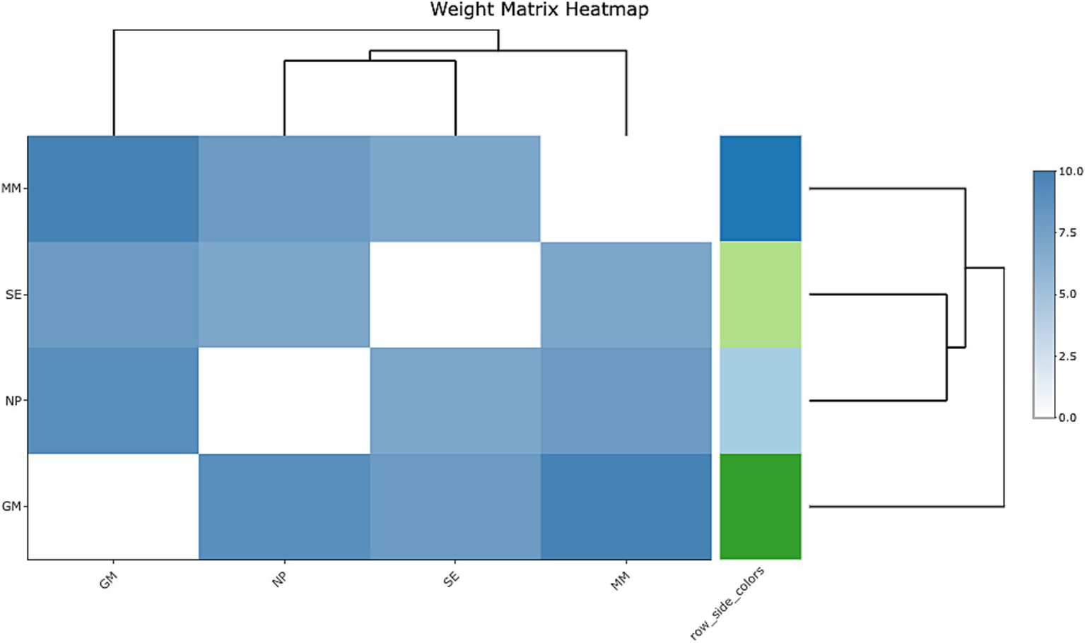 The hierarchical clustering dendrograms at the top and left of the heatmap provide additional insights into the relationships among the variables. MM, SE, and NP form a closely related cluster, highlighting their shared influence on students’ mathematical beliefs and behaviors. The proximity of MM and SE within this cluster underscores their strong interdependence in shaping students’ academic confidence. However, Growth Mindset (GM) appears in a separate cluster, suggesting that it interacts differently with the other variables. This separation may point to GM’s distinct role in fostering a growth-oriented approach to learning, which could have a less direct impact on Mathematical Mindset or Self-Efficacy.