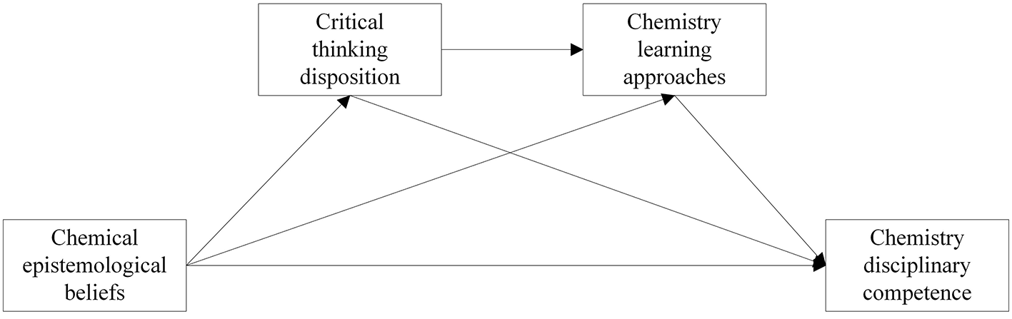 Given that epistemological beliefs could promote students' learning approaches, which is an important condition for developing disciplinary competence, we assume that chemistry learning approaches also play a mediating role in the relationship between chemistry epistemological beliefs and chemistry disciplinary competence. Taking this one step further, as both CT disposition and learning approaches may mediate the effects of chemistry epistemological beliefs on chemistry disciplinary competence, we assume that chemistry epistemological beliefs influence chemistry disciplinary competence through the chain-mediating effect of chemistry CT disposition and chemistry learning approaches.