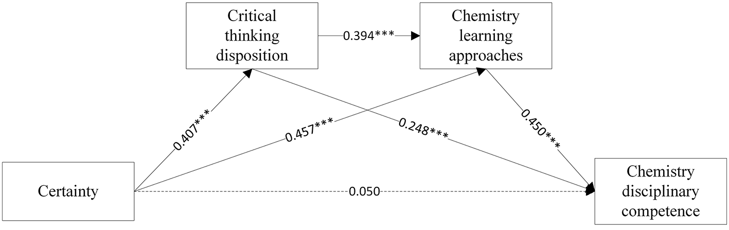 The chain mediating effect of Certainty beliefs and chemistry disciplinary competence.