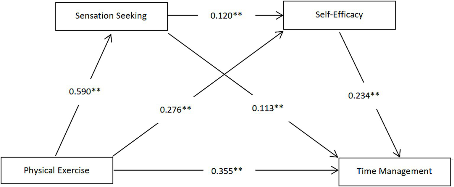 With the intensification of global competition in higher education, students are under increasing multitasking pressure. As a result, time management has become essential for academic success and mental health. The World Health Organization (WHO) 2020 guidelines emphasize the critical role of physical activity in cognitive and mental health. Adults aged 18–64 are advised to engage in at least 150 min of moderate-intensity aerobic exercise weekly. Such activity promotes mental health (e.g., emotional regulation), enhances cognitive functions, and mitigates health risks associated with sedentary behavior. However, Most existing studies overlook the potential mediating mechanisms through which physical exercise may influence time management, such as sensation seeking and self-efficacy. This research gap contrasts with the synergistic framework of the United Nations Sustainable Development Goals (SDGs). Specifically, Goal 4 (Quality Education) emphasizes the development of key competencies (e.g., time management) to enhance academic effectiveness, while Goal 3 (Good Health and Wellbeing) focuses on the promotion of mental health (e.g., self-efficacy) through interventions such as physical activity. This study provides an empirical basis for the simultaneous achievement of these two goals by revealing how physical activity optimizes time management through psychological mechanisms. Based on this, the present study is framed by social cognitive theory (Bandura, 1977), which is particularly well suited to parsing the multilevel mechanisms of behavioral transmission. Its core concepts (e.g., self-efficacy, observational learning) can explain how individuals reinforce efficacy beliefs through successful experiences in physical activity and transfer such beliefs to time management scenarios. This theory provides theoretical support for revealing the chain pathway of how physical activity can improve college students’ time management ability through sensation-seeking-driven behavioral choices and self-efficacy-enhanced goal adherence.