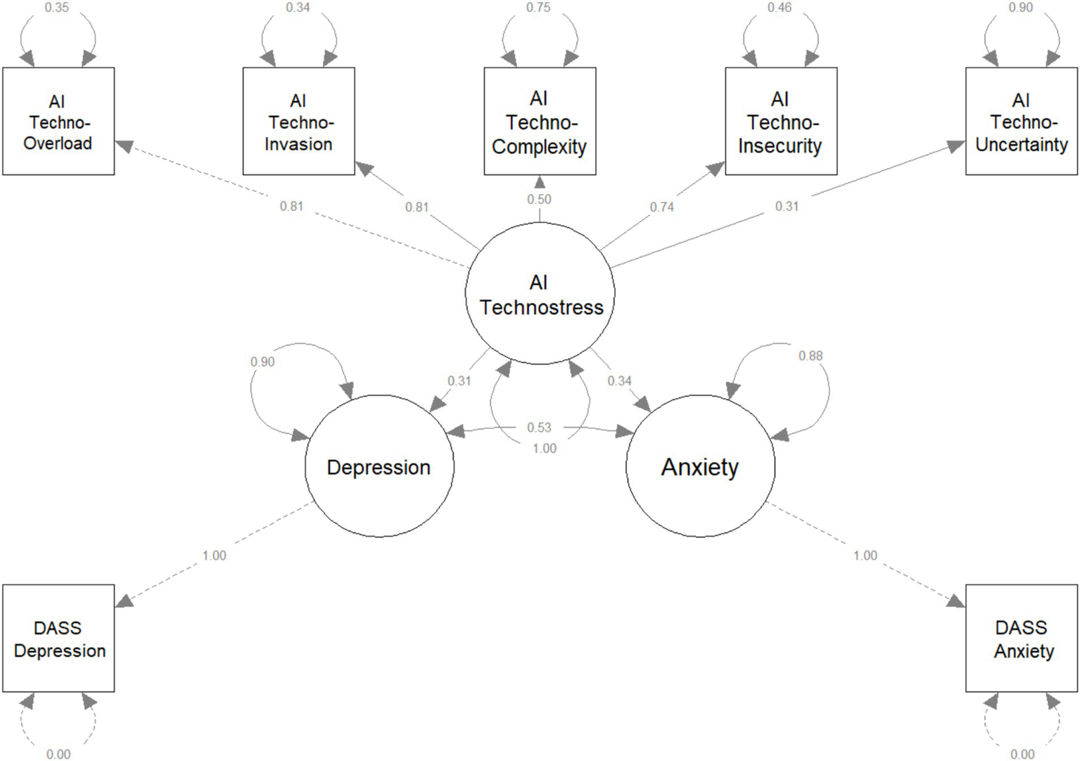 The results supported the proposed model and confirmed both tested hypotheses, indicating that anxiety and depression symptoms are significantly associated with AI-related technostress.