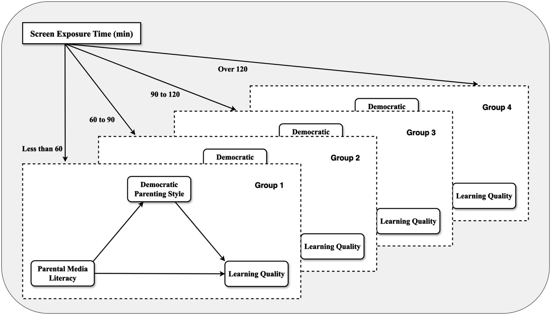In addition, according to the time displacement hypothesis (Hussain, 2012), children who over-rely on and overuse electronic media have longer screen exposure time, which will affect the interaction between parents and children (Hong et al., 2019). In the process, children’s scientific control of screen exposure time can reduce the risk of over-dependence on the medium. Related research has shown that parents with low media literacy lack scientific management of children’s use of electronic media (Yadav and Chakraborty, 2022; Olszewski, 2015), with reduced frequency of dialogues with children (Pagani et al., 2010), and less democratic parenting (Huntington, 2016). This is not conducive to developing children’s attention (Meri et al., 2023) and critical thinking (Cladis, 2020). That is, children’s longer screen exposure time may mean that parents’ lower media literacy hurts children’s quality of learning. Therefore, hypothesis 3 is proposed in this study: In children with different lengths of screen exposure time, the influence of parental media literacy on democratic parenting and preschool children’s quality of learning may differ.