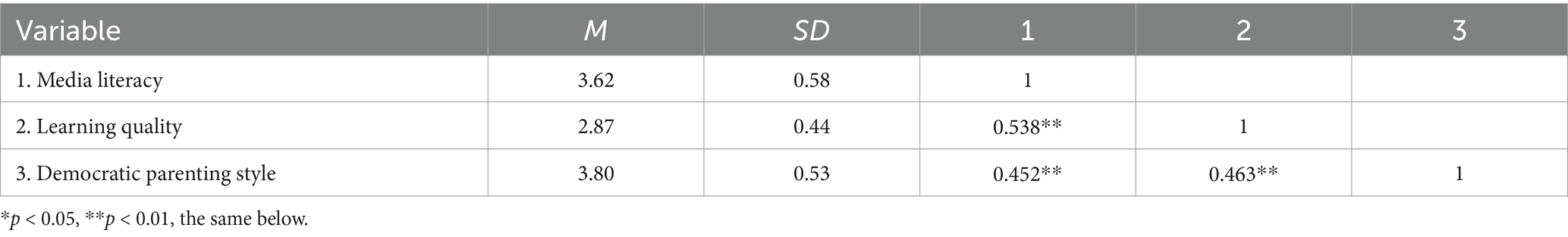 Table 2. The relationship between media literacy and learning quality: an examination of the mediating effect of democratic parenting styles.
