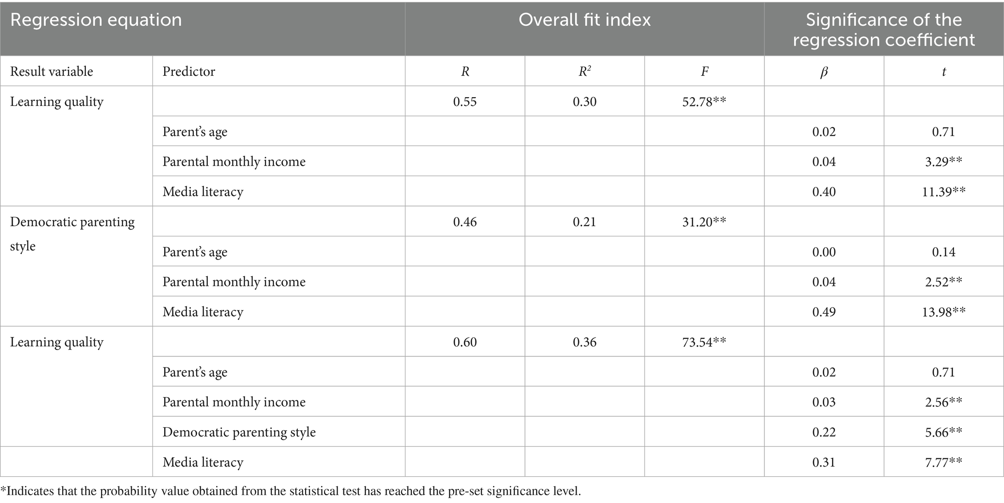 The correlation analysis results of each variable show that parents’ media literacy significantly correlates positively with children’s learning quality and democratic parenting styles. Therefore, there is a significantly positive correlation between democratic parenting styles and children’s learning quality. The test results are shown in Table 1.