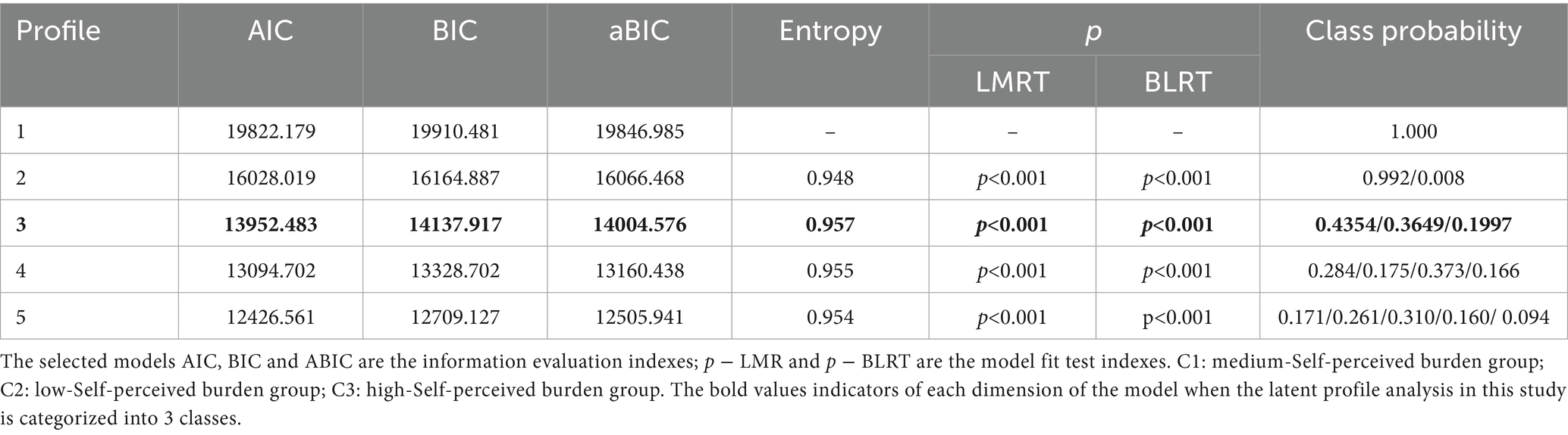 The study selected eight explicit indicators: technology anxiety, Medication literacy, Status of occupational, Caregivers, Residential mode, Medical insurance type, Daily exercise duration, course of disease, Times of hospitalizations, Self-rated sleep status. By progressively increasing the number of latent categories, LPA models were constructed, and participant classification was determined based on analytical results. Finally, leveraging LPA outcomes, systematic analysis was conducted to examine differences in self-perceived burden across distinct patient sub types. In this study, the primary evaluation indicators included the Akaike Information Criterion (AIC), Bayesian Information Criterion (BIC), adjusted BIC (aBIC), and Entropy, which serve to assess the accuracy of classification. A smaller value of AIC, BIC, and aBIC indicates a better model fit, while Entropy ranges from 0 to 1, with values closer to 1 reflecting higher accuracy in model classification. The Lo–Mendell–Rubin adjusted Likelihood Ratio Test (LMRT) and the Bootstrapped Likelihood Ratio Test (BLRT) were employed to compare the fit of two adjacent models, with a p-value of less than 0.05 indicating that the k model was superior to the (k-1) model (Guo et al., 2024). After determining the optimal curve model, SPSS27.0 software was utilized for statistical analysis. The data in this study followed a normal distribution. Measurement data are presented as mean±standard deviation, while count data are expressed as frequencies. Chi-square tests and multifactorial logistic regression analysis were employed to identify risk factors for latent self-perceived burden in older adult patients with chronic comorbidities, with p < 0.05 considered statistically significant.
