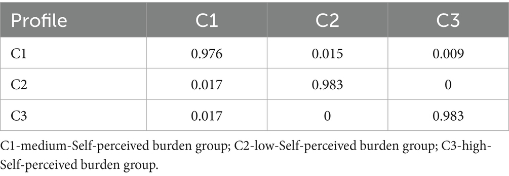 This study used 10 indicators of perceived burden as explicit variables. we gradually increased the number of latent classes from 1 to 5 in this study. When retaining three classes, the Akaike Information Criterion (AIC), Bayesian Information Criterion (BIC), and adjusted Bayesian Information Criterion (aBIC) all reached their lowest values, while the entropy value was the highest. This indicates superior classification accuracy of the model. Furthermore, both the Lo–Mendell–Rubin Likelihood Ratio Test (LMRT) and the Bootstrap Likelihood Ratio Test (BLRT) yielded significant results (p < 0.001). Consequently, we retained the 3-class solution as shown in Table 3. Data in Table 3 demonstrate that during the testing of 2 to 5 classes, the 3-class model outperformed other classification models based on information criterion evaluation. After comprehensive consideration of all factors, the 3-class model was ultimately selected as the optimal solution. The correct classification probabilities for each category were 97.6,98.3 and 98.3% respectively, validating the reliability of the classification and latent profile analysis, as shown in Table 4.