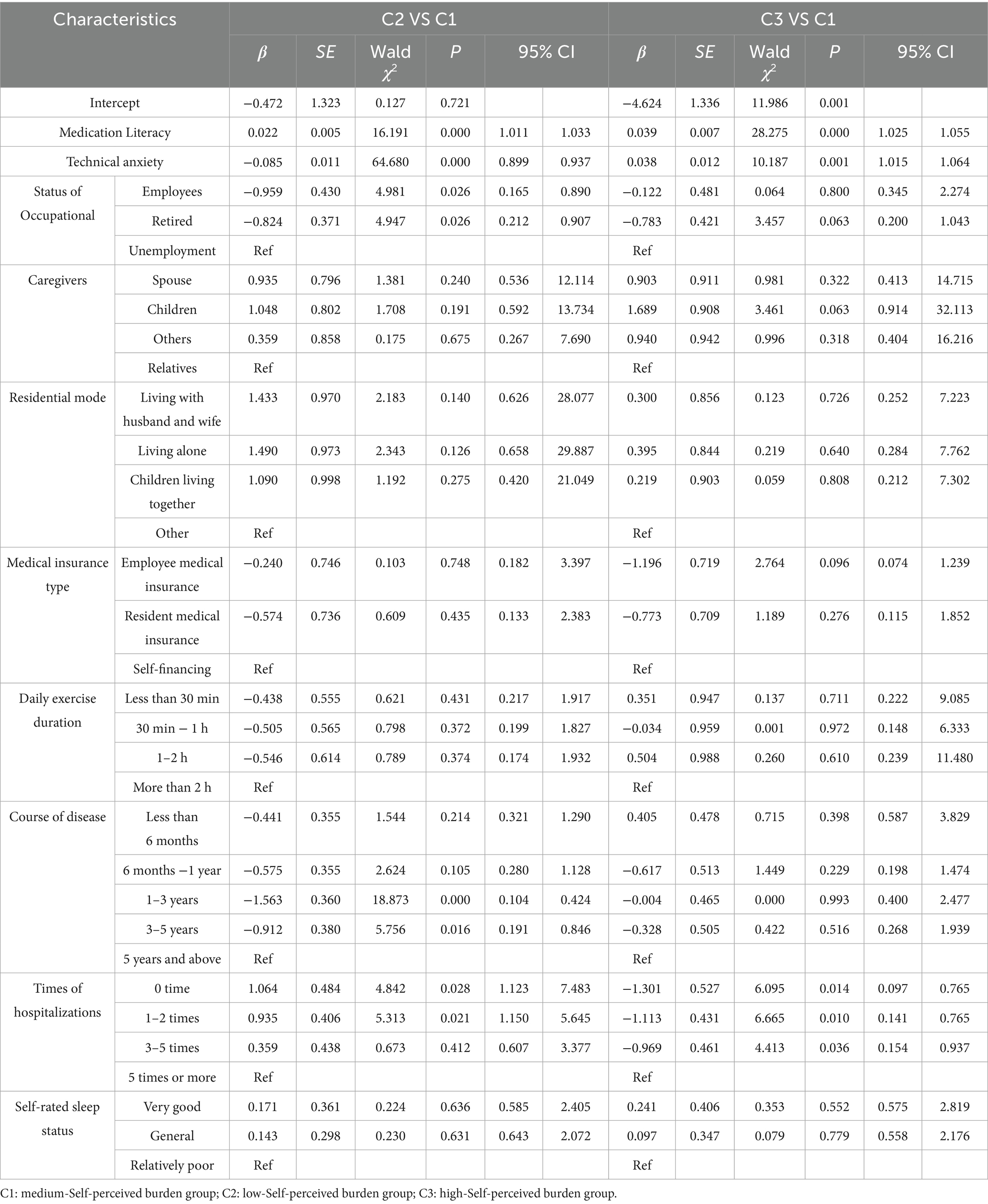 Three latent categories of self-perceived burden in older adult patients with chronic diseases demonstrated statistically significant differences (P<0.05), caregivers, residential mode, medical insurance type, daily exercise duration, course of disease, times of hospitalizations, self-rated sleep status, medication Literacy, occupational status and technical anxiety, as shown in Table 4.