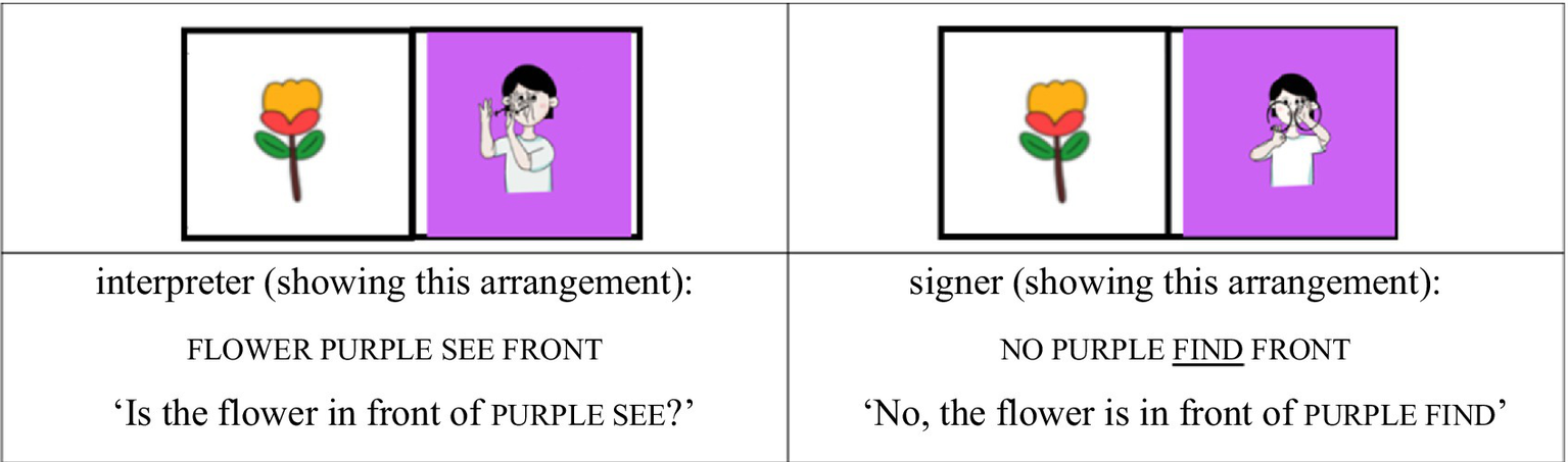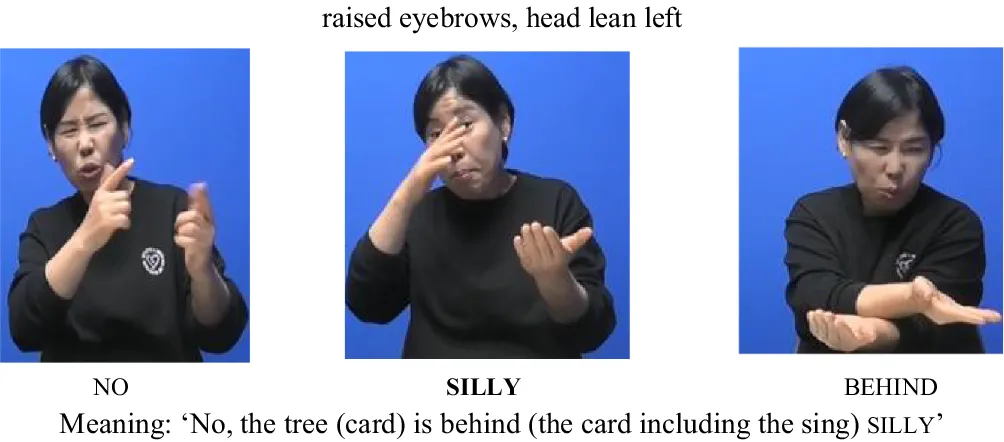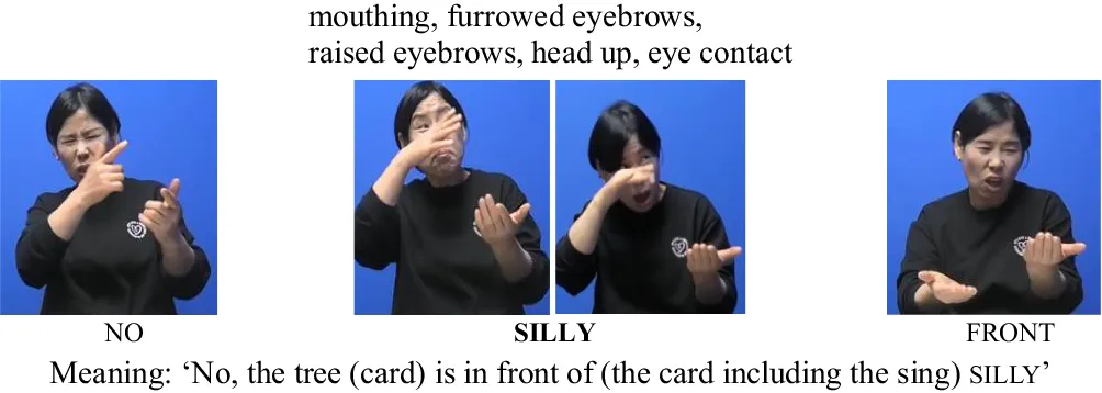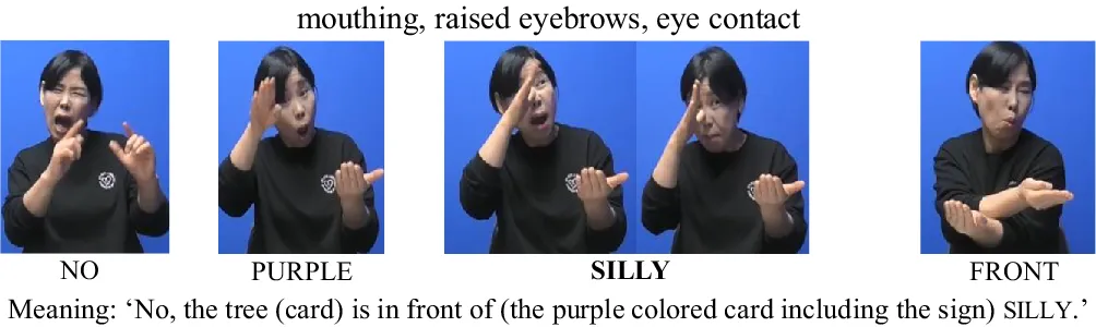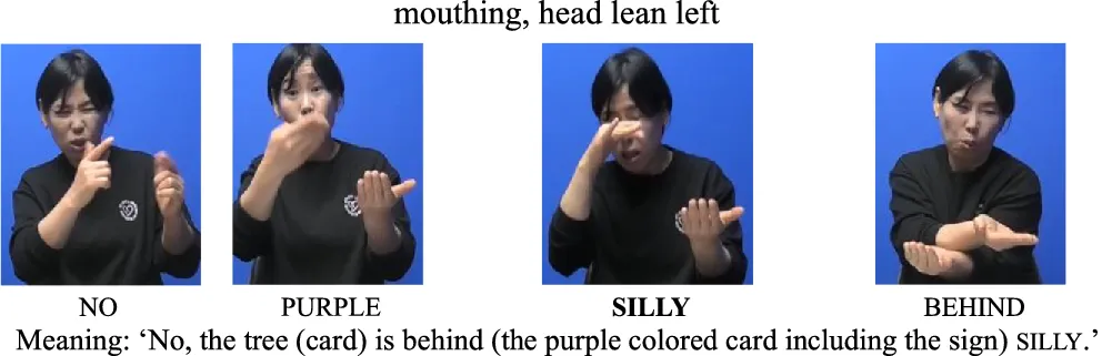 To elicit natural prosodic conditions, we employed a card arrangement task inspired by Choi et al. (2020). Participants were asked to respond to spatial prompts by arranging two types of cards: one set depicting lexical signs such as silly and chicken, and another set displaying images of objects such as trees and flowers. This task was designed to generate discourse contexts in which prosodic marking of prominence and phrasal boundaries could naturally emerge. A key observation from this task was the consistent production of a prosodic pause following the negation sign no. In participants’ responses, no reliably marked the end of the preceding prosodic unit and was immediately followed by the onset of a new prosodic phrase. This boundary was perceptually confirmed by both a professional KSL interpreter and the second author, a sign language specialist.