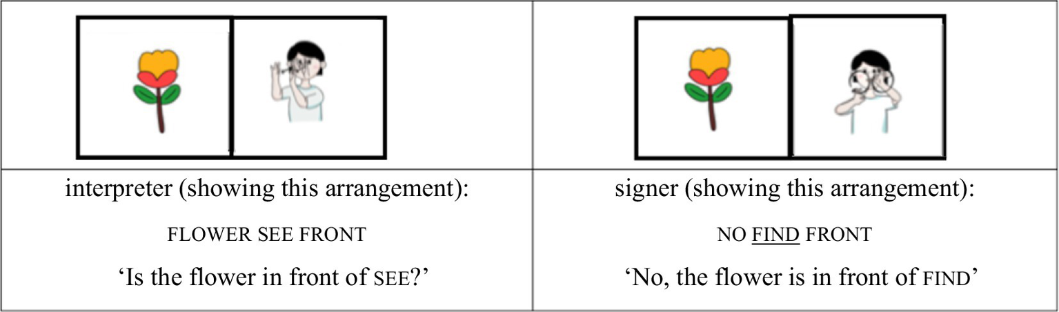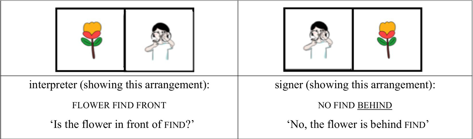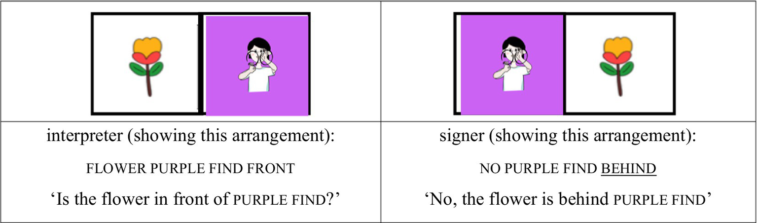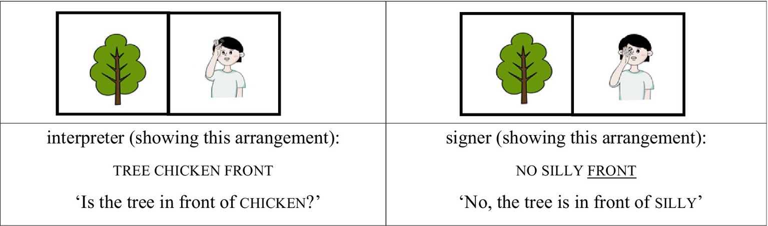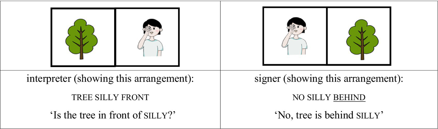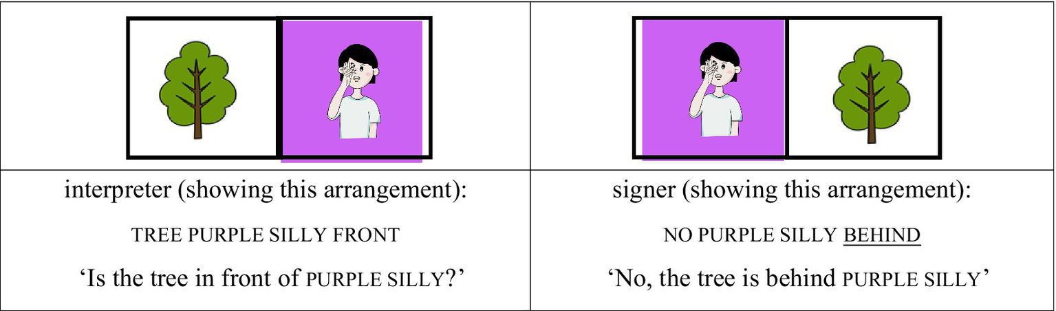 For the AP-initial unfocused condition, the same structure was used, but contrastive focus was shifted away from the noun. For example, when the tree was placed behind silly, the signer responded, “No, the tree is behind silly,” with the focus on the locative expression behind rather than on the noun silly. Although silly still occupies the AP-initial position, it is not the focused element (see Figures 3, 4).