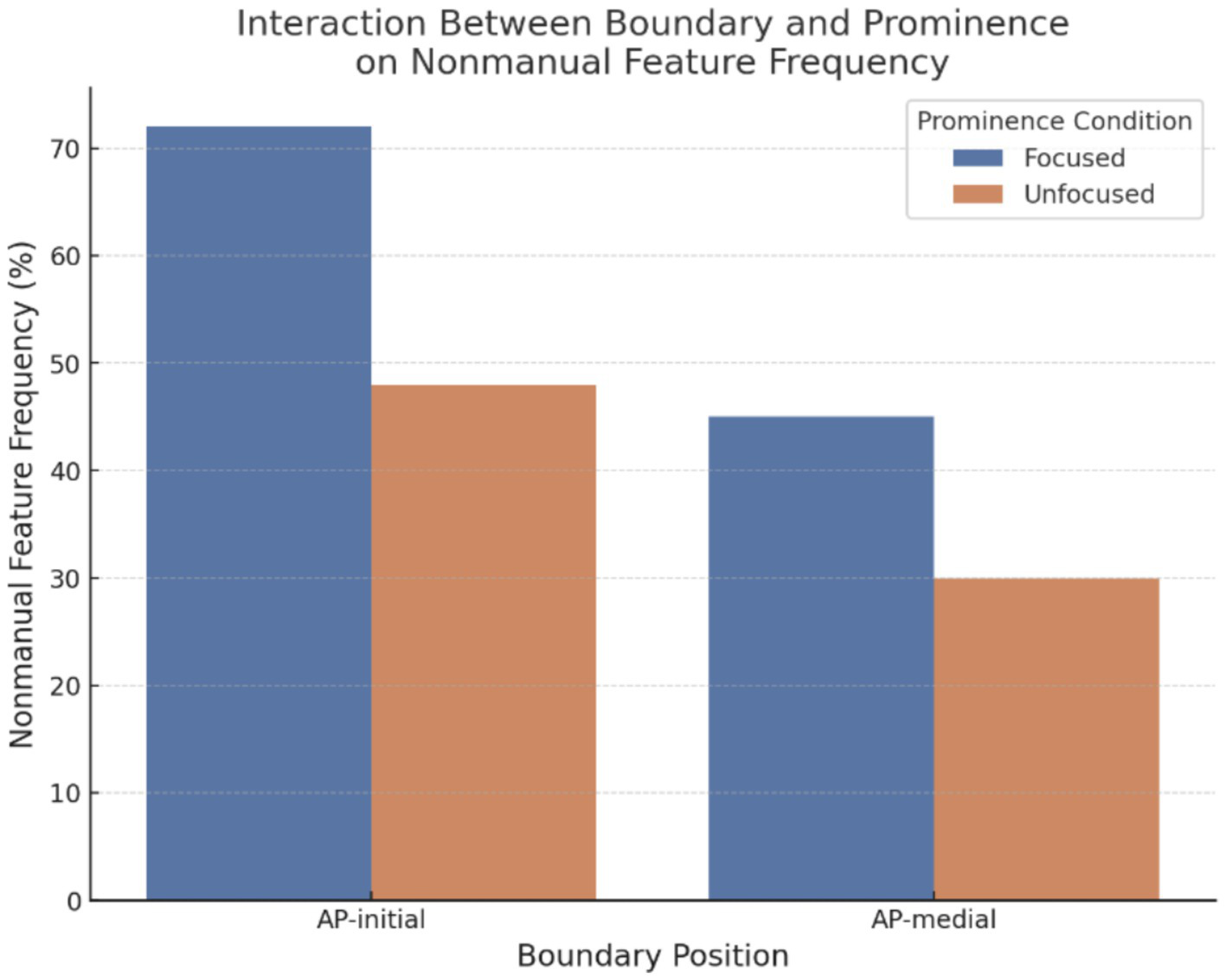 The results showed that prominence had a robust effect on both manual and nonmanual cues. Features like eye contact, furrowed eyebrows, and squinted eyes were significantly more frequent in focused conditions. In contrast, boundary position alone showed minimal impact, with few features differing between AP-initial and AP-medial positions. Although some interaction effects were found, they were not consistent across features.