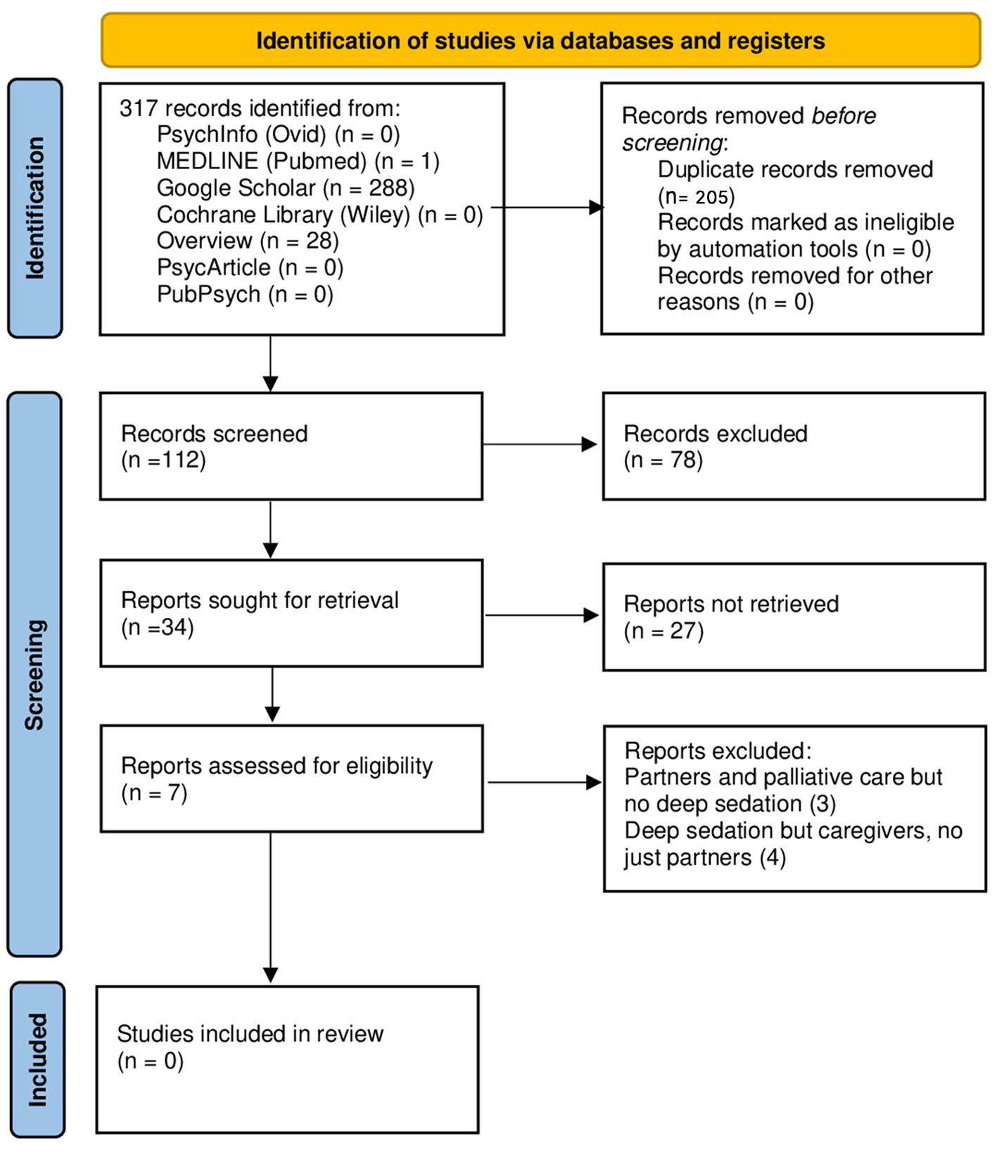 Using the six search engines previously described, the keywords generated an initial set of 317 articles. Considering the breadth of databases consulted and the 12-year time frame (2010–2023), this number appears relatively limited. As already mentioned, the selection process did not yield any studies specifically examining the psychological consequences experienced by bereaved partners after the use of continuous deep sedation (CDS). Although several studies have explored sedation practices or general family experiences, none addressed the particular situation of spouses—despite evidence identifying them as the relatives at highest risk for grief-related complications (Fernández-Alcántara and Zech, 2017; Garrouste-Orgeas et al., 2019; Prigerson et al., 2009).