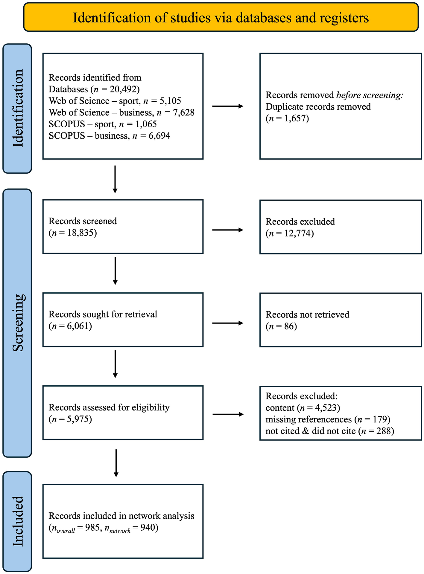 As a first step of the CNA a systematic literature search was conducted using the PRISMA guidelines (Page et al., 2021). Articles were searched in the SCOPUS database from Elsevier and the Web of Science Core Collection (cf.) (Parra-Martinez and Wai, 2023; Bruner et al., 2009). With both, we covered the two biggest databases for peer-reviewed literature and the most powerful research engine for citation data. Search criteria were limited to (1) articles and reviews, (2) published in the source type journal, and (3) English language literature, regardless of publication date. Owing to the substantial volume of articles and the emphasis placed on quality, the decision was made to exclude conference papers (by possibly presenting preliminary results) and abstracts (without a complete reference list) from the study. Further, accessibility to a wider audience as well as the potential for duplicate inclusion of findings, monographs and dissertations/theses were excluded. The search was limited to the subject areas “business, management, and accounting (all),” “economics, econometrics, and finance,” “psychology (all)” and “undefined,” given the vast number of possible articles. To provide a holistic representation of the connection between domains, the limitations ensure that the found articles have a direct relevance to the topics pertinent to the research question. Additionally, including “undefined” allows for a broader search to capture potentially relevant articles that may not fit clearly into any of the other categories. As “sports” was not a subject area itself, articles within this context fell under “undefined” or “psychology (all).”