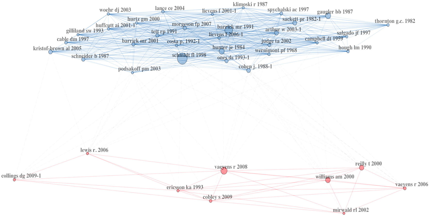 The additional co-citation network analysis (Figure 3) supports the findings. The network is divided into two main clusters. The first cluster on the top (blue) is centered around Schmidt and Hunter (1998), Barrick and Mount (1991), and Hunter and Hunter (1984), focusing on the validity and reliability of various selection methods and their comparison. Additionally, articles dealing with personality traits (e.g., Judge and Ilies, 2002; Tett et al., 1991) as well as focusing on AC (Arthur et al., 2003; Gaugler et al., 1987) are located in this cluster. The co-citation of Cohen (1988) shows a slight connection to the second cluster due to its proximity to the cluster, as indicated by statistical information. Within the other cluster (red), sports articles are included, primarily related to Vaeyens et al. (2008), providing an overview of TID in sports and Reilly et al. (2000), a review of anthropometric and physiological predispositions for soccer. Further analyses of the network, e.g., author collaborations and co-occurrence of words, which exceed the scope of the article, can be found in the Open Science Framework (https://uni.ms/xbu2i).