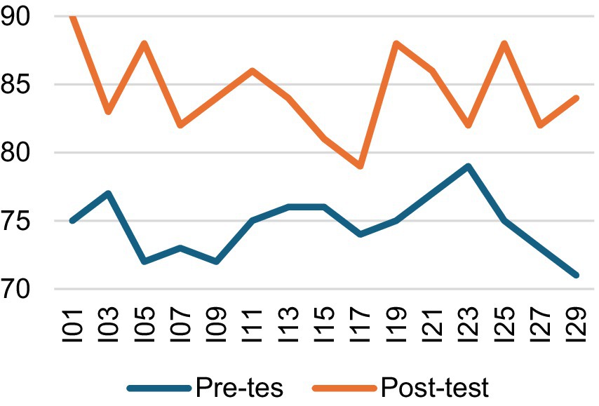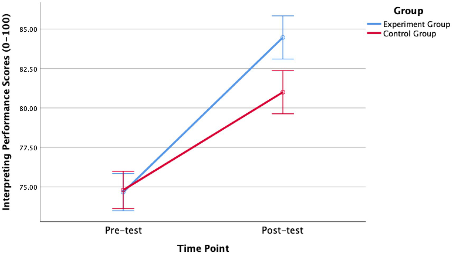 A two-way mixed-design ANOVA (2 × 2) was then conducted, with time (pre-test vs. post-test) as a within-subjects factor and group (experimental vs. control) as a between-subjects factor. The results revealed a significant main effect of time, F(1, 28) = 127.76, p < 0.001, η2ₚ = 0.82, indicating that participants’ interpreting performance improved substantially from pre-test (M = 74.73, SD = 2.20) to post-test (M = 82.73, SD = 3.10) across both groups. As illustrated in Figures 1, 2, both groups showed performance gains over time, although the improvement was more pronounced in the experimental group. A significant time × group interaction, F(1, 28) = 9.97, p = 0.004, η2ₚ = 0.26, further confirmed that the intervention had a greater positive effect on the experimental group. According to Cohen’s (2013) benchmarks, these effect sizes are large, with time explaining 82% of the variance and the interaction accounting for 26.2%. Follow-up analyses using independent-samples t-tests on gain scores (post–pre) showed that the experimental group [M = 9.80, SD = 3.91, 95% CI (7.63, 11.97)] achieved significantly larger improvements than the control group [M = 6.20, SD = 3.84, 95% CI (4.07, 8.33)], t(28) = 2.54, p = 0.017, Hedges’ g = 0.90 [95% CI (0.14, 1.65)]. These findings indicate that although both groups demonstrated learning progress, the peer assessment intervention produced notably greater gains for the experimental group. The overall performance trend is depicted in Figure 3.