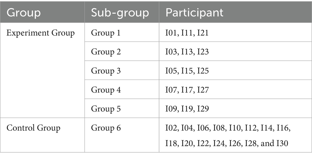 All participants were native Chinese speakers with good English proficiency and a foundational understanding of interpreting, acquired through prior coursework and training. Participants were assigned to two groups (see Table 1), an experimental group (n = 15) and a control group (n = 15) using systematic sampling based on student ID to ensure balanced and objective group allocation (Ballance, 2024; Mahama et al., 2022; Wilhelm et al., 2017). To facilitate ongoing collaboration and minimize disruption from absences or withdrawals, the experimental group was further divided into five smaller peer assessment sub-groups, each comprising three members. The control group consisted of 15 students who did not participate in peer assessment activities.