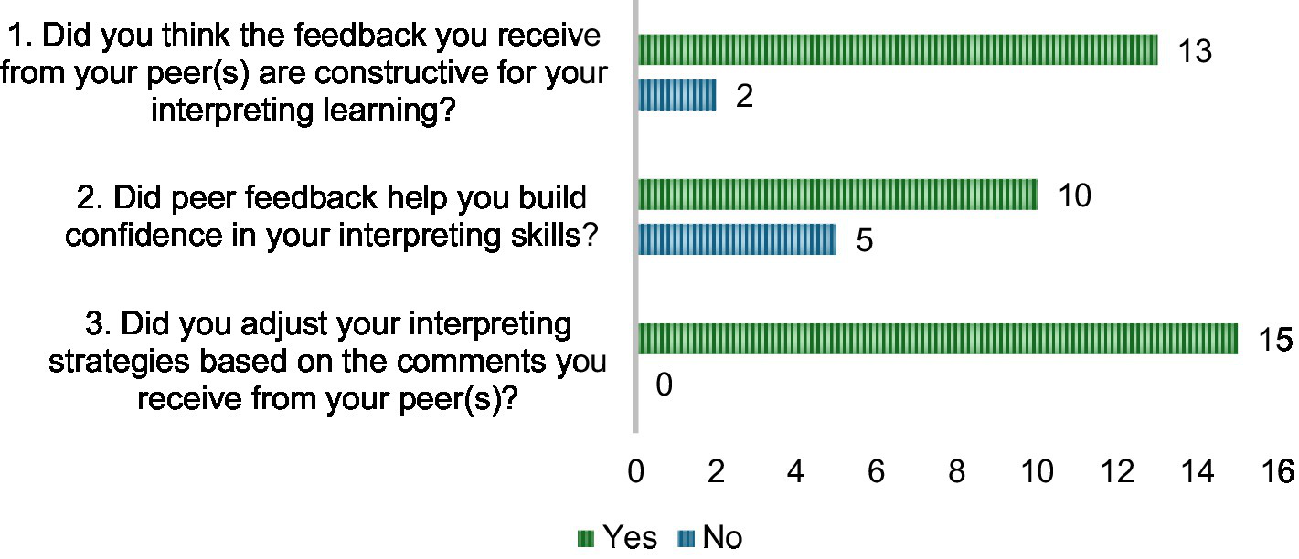 The survey results further supported the RQ1. As shown in Figure 4, a large majority of students perceived peer assessment as beneficial to their interpreting performance. For Question 1 (Did you think the feedback you receive from your peer(s) are constructive for your interpreting learning?), 13 out of 15 students (86.7%) agreed that the feedback they received from their peers was constructive for their interpreting learning, while only 2 students (13.3%) responded negatively. In Question 2 (Did peer feedback help you build confidence in your interpreting skills?), 10 students (66.7%) reported that peer feedback helped build their confidence in interpreting, although 5 (33.3%) did not agree on this view yet observe improvement in their interpreting performance. Notably, in Question 3 (Did you adjust your interpreting strategies based on the comments you receive from your peer(s)?), all 15 students (100%) indicated that they adjusted their interpreting strategies based on the comments received from peers. These results suggest that peer assessment played a key role in raising students’ awareness of their performance and encouraging actionable improvement, even if its impact on confidence varied among individuals.