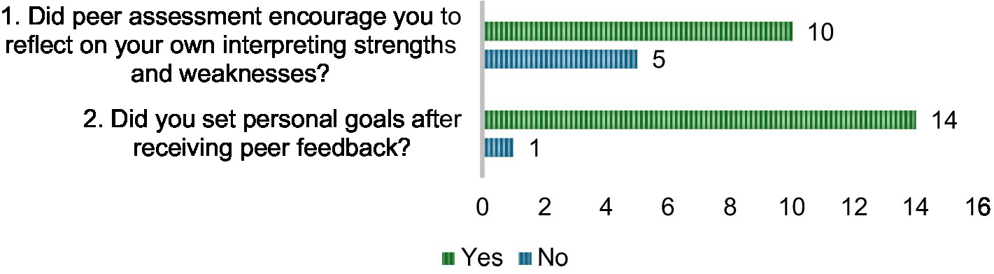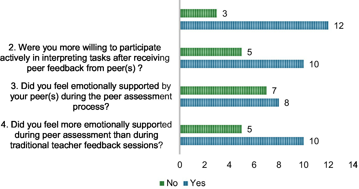To explore the students’ perceptions of peer assessment and its impact on their interpreting performance, engagement, and SRL, a post-intervention survey was conducted with all students in the experimental group (n = 15). The survey was designed in alignment with attachment theory, emphasizing the emotional and social dimensions of peer interaction in learning. It consisted of both closed-ended and open-ended questions. The closed-ended questions (n = 9) focused on students’ emotional support, confidence, participation, reflection, and learning behaviors, comparing their experiences with peer assessment and traditional teacher-led feedback. These questions were designed to capture students’ agreement on the usefulness and emotional impact of peer assessment. The open-ended questions (n = 9) invited students to elaborate on their experiences with peer relationships, feedback usefulness, changes in learning strategies, and emotional or motivational differences between peer and teacher feedback. Furthermore, in order to ensure content validity, the survey questions were sent to an expert in the same educational field before distributing to the students.