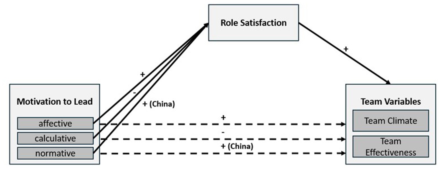 Introduction: Motivation to lead (MTL) has been identified as a key predictor of leadership effectiveness. It comprises three distinct facets—affective, calculative, and normative MTL—which differentially impact leadership outcomes. However, we know little about how these facets affect team climate and team effectiveness across cultures and from leader and follower perspectives. Additionally, we examine the influence of role satisfaction with the leader role within this relationship.