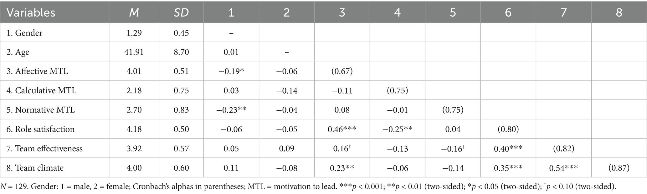 For this sample, the same hypotheses as in both German samples were made. Additionally, we predicted positive correlations of normative MTL with team outcomes and role satisfaction and also role satisfaction mediating the positive effects of normative MTL on the team outcomes. Table 5 depicts the means, standard deviations, reliabilities and intercorrelations of the measured scales. We again controlled in our analysis for gender. It again had no effect on the results, so we report results without controls. The Chinese data showed a strong significant positive correlation between affective and normative MTL of 0.59 (p < 0.001).