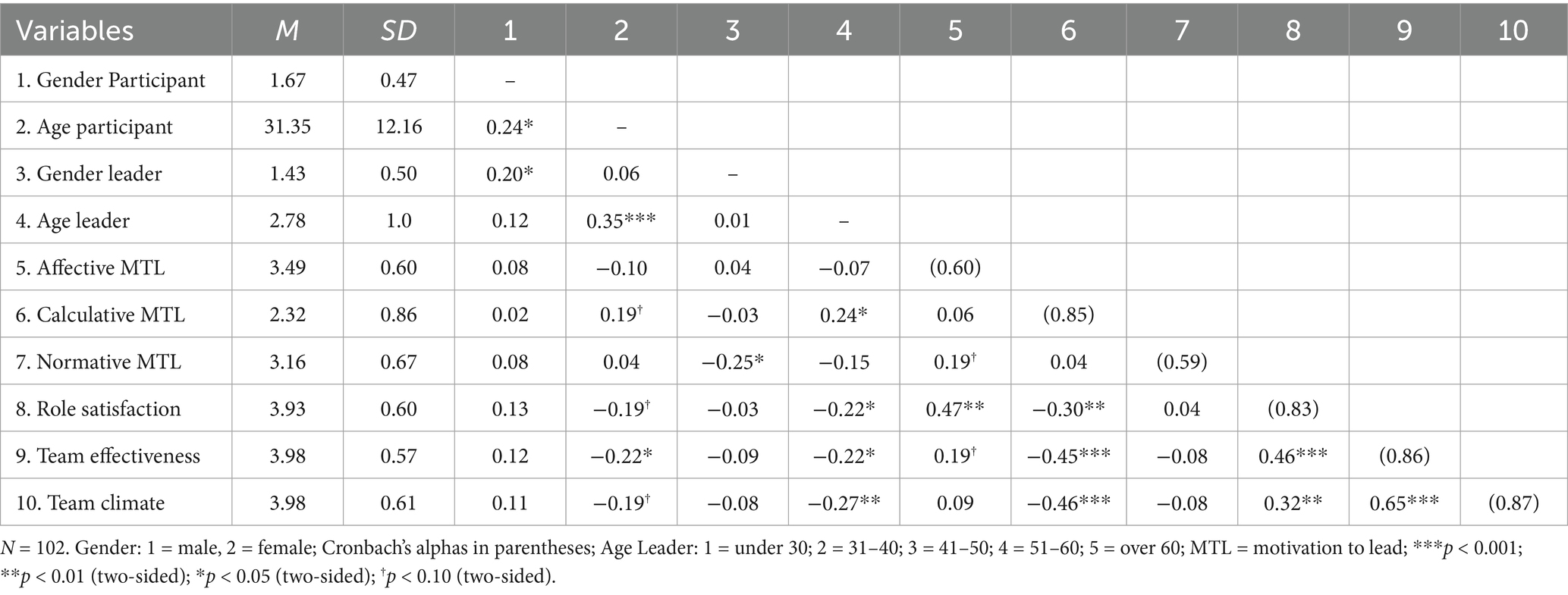 For the predictions of our studies which focus on the effects of MTL on team-related outcomes, we consider prior findings regarding the effects of the MTL facets as well as the logic of the SDT and an effect of culture. For affective MTL we predict consistent positive results, because of the consistent positive effects in prior research on outcomes and positive leadership styles as well as its intrinsic nature. In contrast, for calculative MTL we predict consistent negative results because of its consistent negative effects in prior research on outcomes, its connection to negative leadership styles and its extrinsic nature. For normative MTL we predict a more differentiated picture. On the one hand, the meta-analysis by Badura et al. (2020) showed a weak positive effect on leadership effectiveness and positive correlations with transformational leadership as well as transactional leadership. On the other hand, normative MTL is an extrinsic motivation and Hendricks and Payne (2007) found no effects on team performance (which is especially relevant for this study) and negative effects on perceived leadership effectiveness. Because of this mixed evidence, we predict positive effects of normative MTL on team-related outcomes for the Chinese sample only, because normative motivation – despite being more extrinsic - should be valued positively due to the collectivistic culture (Hofstede, 1984) and interdependent construction of the self (Markus and Kitayama, 1991) in China. In contrast, there is no consistent evidence for either a positive or negative relation for Germany. Also, we do not make any differential predictions based on the perspective (leader or follower), as we assume the relations to be equivalent regarding their valence for both.