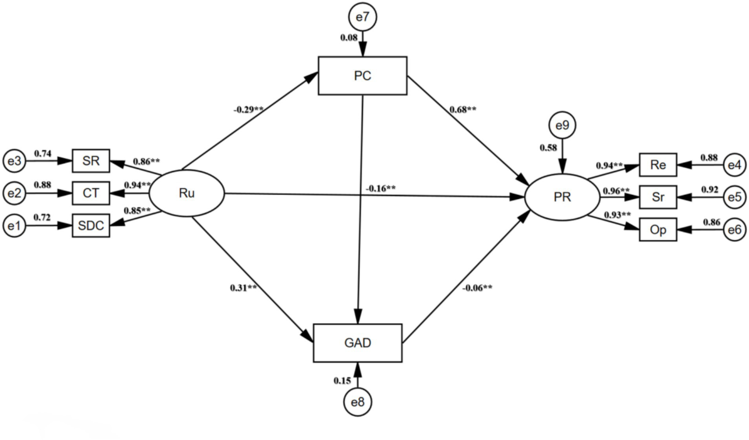 This study first used AMOS 28.0 to perform structural equation modeling to examine the structural relationships among rumination, proactive coping, generalized anxiety disorder, and psychological resilience. The model fit indices were good (GFI = 0.964, AGFI = 0.928, NFI = 0.977, IFI = 0.979, TLI = 0.967, CFI = 0.979, PNFI = 0.628, PCFI = 0.629, RMSEA = 0.086), providing initial support for the path relationships among the variables. This study used Hayes’ PROCESS (version 3.4) in SPSS 26.0 to construct a multiple mediation model, with demographic variables such as age, family residence, and being an only child as control variables. After controlling for demographic variables, the results (Table 3) showed that: (1) rumination had a significant negative predictive effect on proactive coping (B = -0.279, p < 0.01); (2) rumination had a significant positive predictive effect on generalized anxiety disorder (B = 0.289, p < 0.01) and a significant negative predictive effect on psychological resilience (B = -0.367, p < 0.05); (3) after including proactive coping and generalized anxiety disorder, the predictive effect of rumination on psychological resilience weakened but remained significant (B = −0.161, p < 0.01), psychological resilience had a significant positive predictive effect on proactive coping (B = 0.669, p < 0.01), and psychological resilience (B = −0.056, p < 0.01) had a significant negative predictive effect on generalized anxiety disorder.