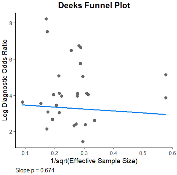 The Deeks' funnel plot asymmetry test revealed no significant evidence of publication bias among the included studies (P = 0.674), indicating that the meta-analysis results are unlikely to be affected by selective publication (see Figure 6).