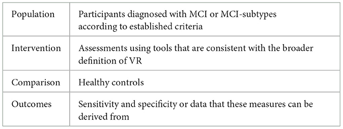 1. Studies must involve patients diagnosed with Mild Cognitive Impairment (MCI), including its subgroups (e.g., amnestic MCI), based on recognized diagnostic criteria e.g., the Petersen criteria or recommendations of the National Institute on Aging (Albert et al., 2011; Petersen, 2004).