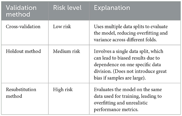 However, as machine-learning models are being used in a good portion of the included studies, this brings a new dimension to the quality assessment process. The QUADAS-2 index domain will therefore be switched out with an assessment of the machine-learning validation method being employed. Currently a new edition of the QUADAS-2 for studies using AI is being developed (QUADAS-AI), but has not yet been published and is expected to be finished by late 2024 to early 2025 (Guni et al., 2024). The main differences will probably be in the index test assessment section, as machine-learning is being used in the index test. Based on the current literature, machine-learning validation methods using cross-validation will be assigned “low-risk”, methods using the holdout-method will be assigned “moderate-risk” and finally methods that do not split the data-set into training and test (resubstitution method) will be assigned “high-risk” (see Table 3). It is important to note that the risk of bias in the holdout method is also influenced by sample size. When sample sizes are large, the risk of bias is minimal. This will be accounted for when evaluating risk of bias. In summary, the QUADAS-2 domains are used for assessing risk of bias in the included machine-learning studies, with the index domain adjusted to evaluate risk of bias according to the validation method being used. There are several types of validation methods, but a more in-depth explanation is outside the scope of this article. For a deeper explanation of machine-learning validation methods see Diniz (2022).