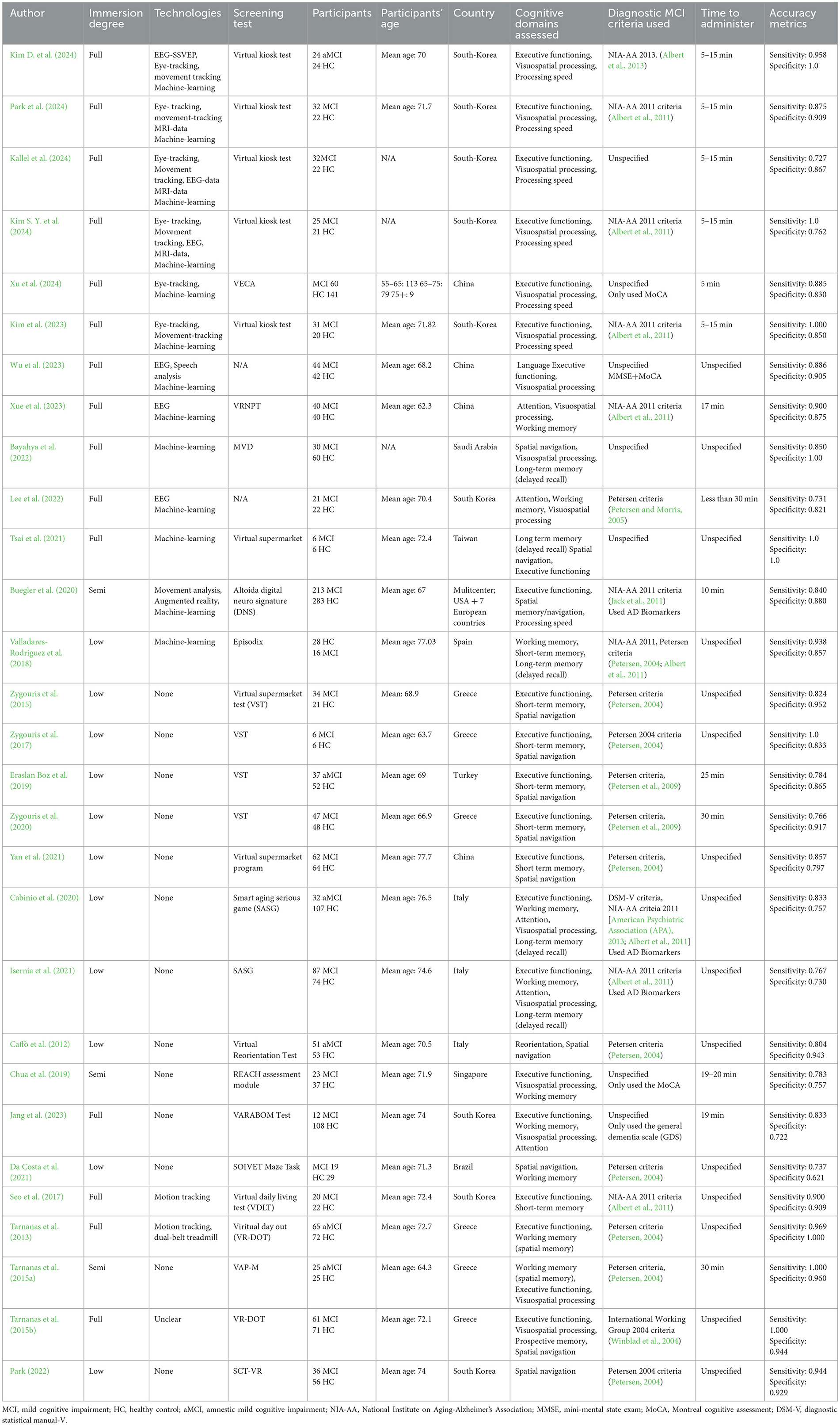 Of the 29 studies, 6 specifically assessed the accuracy of VR-based assessments for patients with amnestic mild cognitive impairment (aMCI), while 23 focused on all MCI subtypes. In terms of immersion levels, 15 studies were fully immersive, utilizing VR headsets to create complete virtual environments. Three were semi-immersive, employing large screens or projections to provide partial immersion, while 8 were non-immersive, relying on devices like tablets or desktop computers. Most studies utilized cross-sectional designs, except for four (Buegler et al., 2020; Tarnanas et al., 2013; Zygouris et al., 2017; Tarnanas et al., 2015b), which employed longitudinal designs.