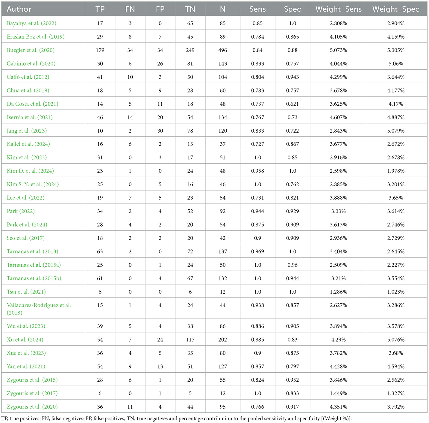 Table 5. Diagnostic accuracy, classification and weighting toward pooled sensitivity and specificity.