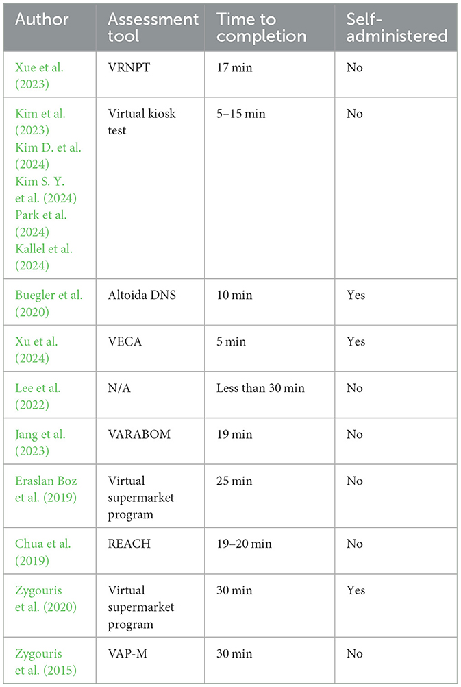 A key pattern observed across the studies is the use of various activities of daily living (ADL) in the VR-assessment. Only eight studies did not integrate ADL as a core component of their assessments (Bayahya et al., 2022; Caffò et al., 2012; Da Costa et al., 2021; Lee et al., 2022; Park, 2022; Valladares-Rodriguez et al., 2018; Wu et al., 2023; Xue et al., 2023). The ADL-based studies incorporated a range of practical tasks, such as completing a fire evacuation scenario (Tarnanas et al., 2013, 2015b), taking the bus and using an ATM (Seo et al., 2017), performing household chores (Cabinio et al., 2020; Chua et al., 2019; Isernia et al., 2021), searching for hidden items in a home environment (Buegler et al., 2020), visiting a museum (Tarnanas et al., 2015a), or caring for a grandchild (Jang et al., 2023).