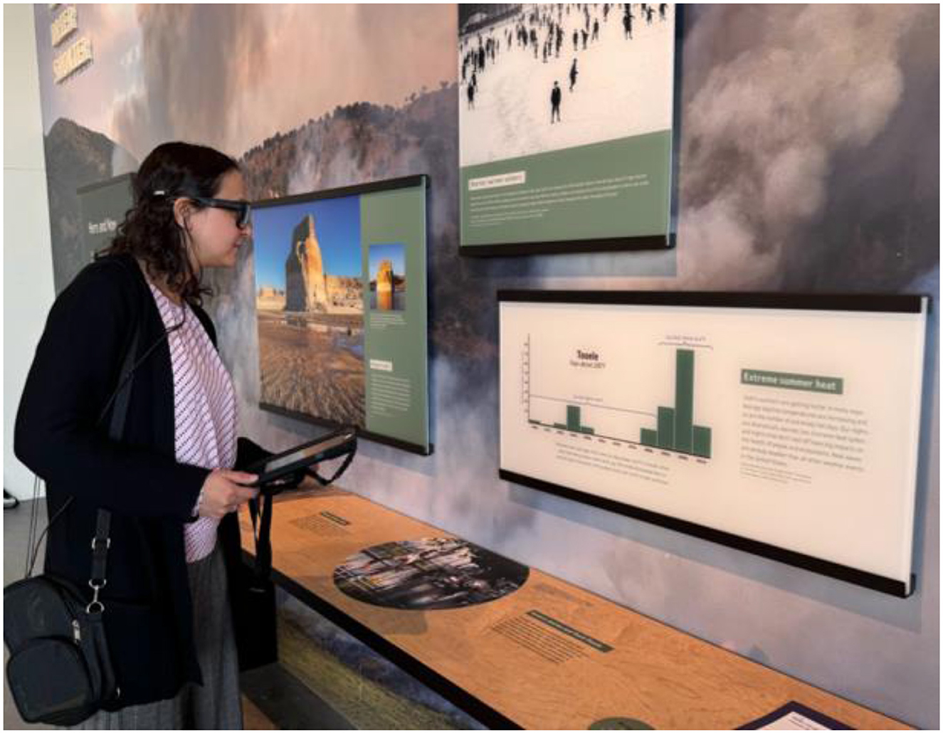 Figure 1. A visitor exploring a climate change exhibit while wearing a mobile eye tracker. Additionally, a tablet (held in hand) can be integrated to answer questions (e.g., experiences) and complete tasks (e.g., discuss with others) in real-time.