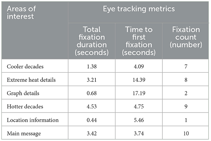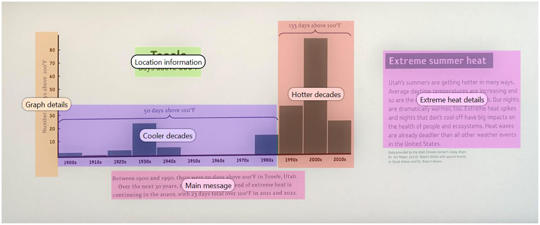 Before starting data collection, participants were set up with a mobile eye tracker and calibrated. Participants were not provided with specific instructions on what to engage with as they moved through the exhibit. Instead, they were prompted to interact with the exhibit as they typically would and view what they would like to naturally—often referred to as a free-view task. Given the critical information presented in this climate change exhibit, it is extremely relevant for the exhibit designers to know if the visitors are paying attention to and learn from it. An analysis of pilot eye tracking data is presented to showcase how eye tracking data could be used to objectively examine visual engagement with core portions of the museum exhibit through visualization and quantitative eye tracking metrics. For illustrative purposes, in our analysis, we selected a specific portion of the exhibit that provides critical information to visitors about extreme heat-related changes that are linked to climate change; see Figures 3, 4.