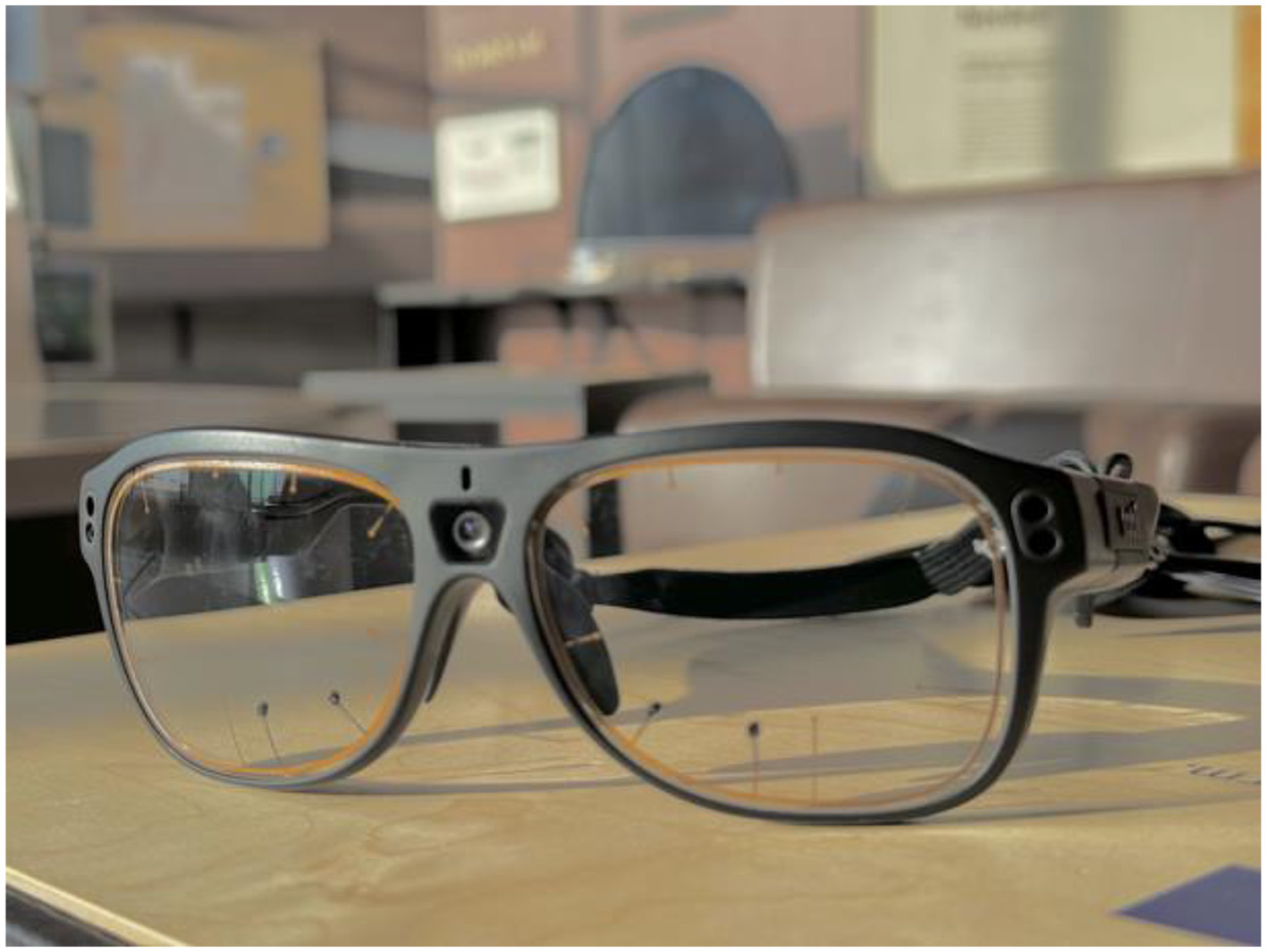 For example, a recent mobile eye tracker (Tobii Pro Glasses 3, 2020; as shown in Figure 2) has five cameras per set of glasses. Four of these are used to track the movements of the eye and are located on the outer rim of the glasses, with two cameras dedicated to each eye. The fifth camera is located above the bridge and is used to record “scene video,” which is a regular recording from the wearer's vantage point as they move throughout the exhibit. Additionally, this model has a microphone that records audio (Tobii Pro Glasses 3, 2020, 2024), which can be utilized for additional analysis. While collecting data from this eye tracker, the glasses are worn by a wearer while exploring the exhibit, along with additional equipment (such as a tablet, to collect survey or response data in real-time, as shown in Figure 1). The glasses are remotely (wirelessly) controlled via a computer that allows researchers to start and stop data collection and provides a live feed from the tracker. The data from the cameras and microphone is then merged into a single video file that contains the wearer's view of the environment and their gaze. This allows researchers to virtually ride along with the wearers and see exactly what they see, yet not be in the physical vicinity of the wearer (which is relatively less disruptive than being in physical proximity). Furthermore, the accuracy of mobile eye tracking has been improving over subsequent generations (Onkhar et al., 2024). Therefore, newer models of eye trackers are more robust to changing conditions compared to earlier models, making naturalistic data collection at exhibits more feasible.