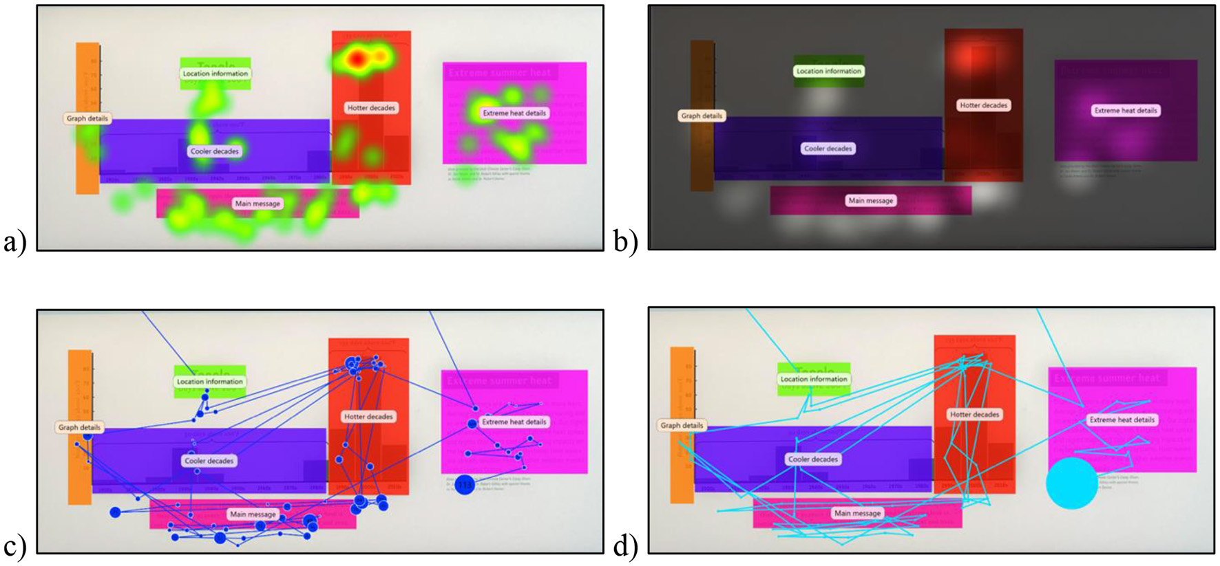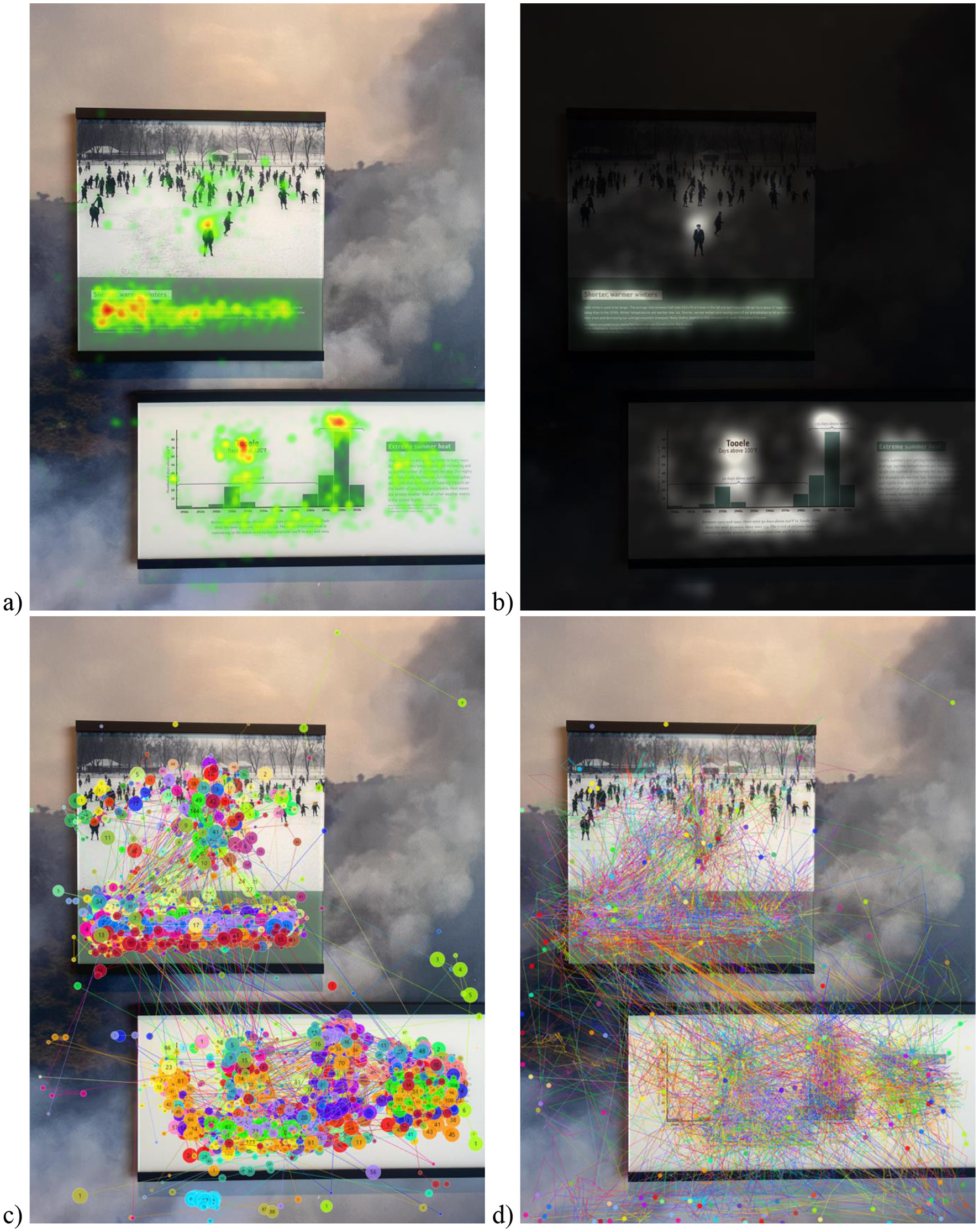 Figure 3. Examples of different data visualizations are presented (based on data from 50 participants). The same portion of the exhibit is presented with four different types of visualizations: (a) Heat maps, (b) Opacity maps, (c) Scan path, and (d) Beeswarm.