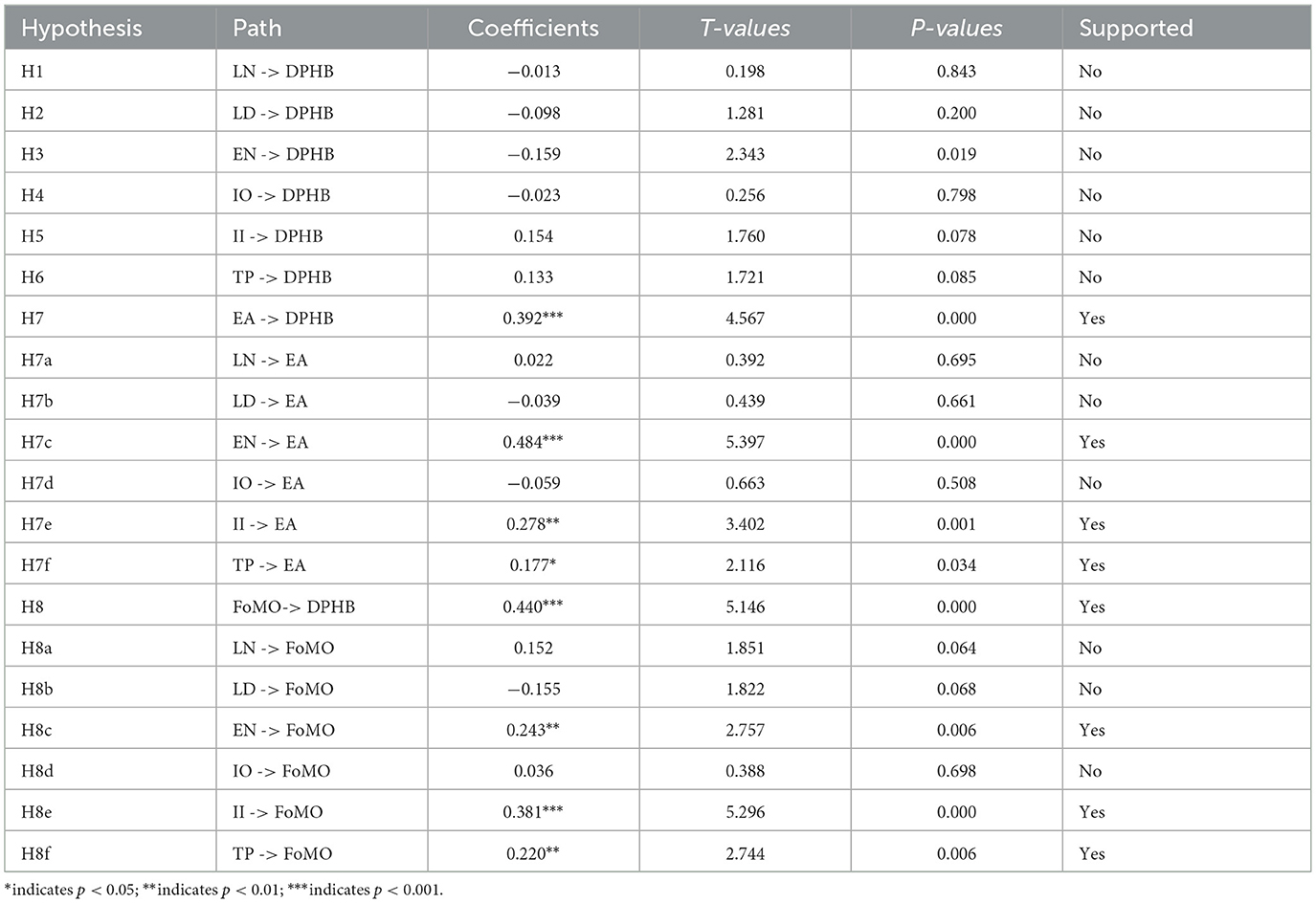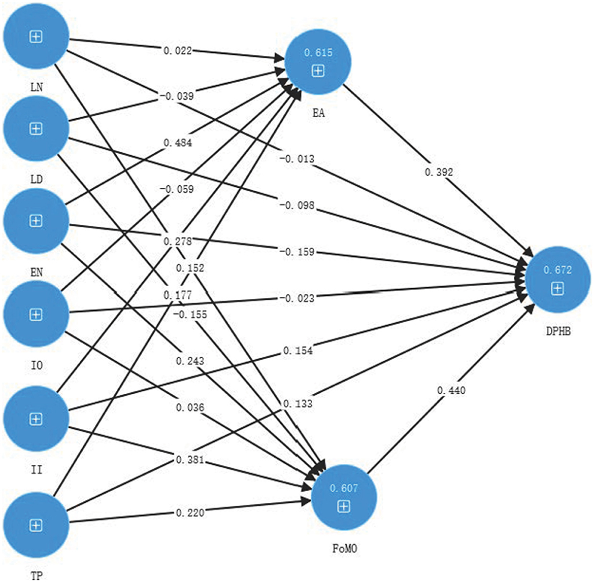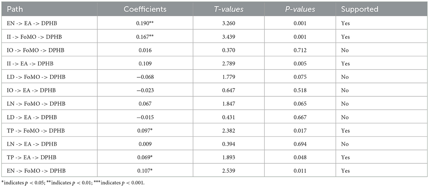 The path coefficient represents the strength of the direct causal relationship between variables. In a path model, the arrow from an independent variable (predictor variable) to a dependent variable (predicted variable) represents a hypothesized causal connection, and the path coefficient is the quantification of the strength of this connection. As shown in Table 4, the results show that emotional attachment has a significant positive effect on digital photo hoarding. Emotional need, interpersonal influence, and technological progress have significant positive effects on emotional attachment. Hence, H7, H7c, H7e, H7f are supported. Fear of missing out has a significant positive effect on digital photo hoarding. Emotional need, interpersonal influence, and technological progress have significant positive effect on fear of missing out. Hence, H8, H8c, H8e, H8f are supported.
