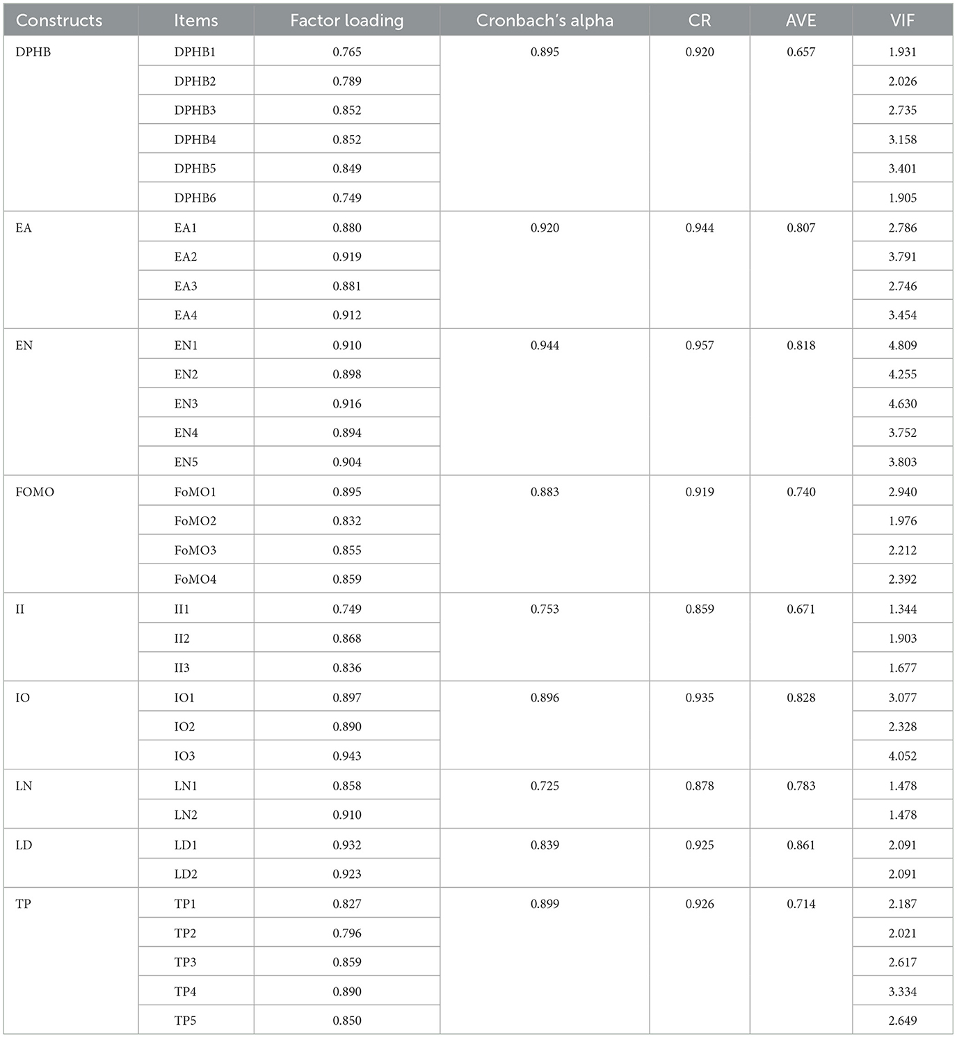 Conducting reliability testing on the questionnaire can reveal the level of consistency. The measurement indicators include Cronbach's Alpha coefficient and Composite Reliability (CR). When Cronbach's Alpha is between 0.7 and 0.8, it indicates that the overall reliability of the questionnaire meets the requirements. When Cronbach's Alpha is >0.8, it indicates that the overall reliability of the questionnaire is good (Zaremohzzabieh et al., 2024). When Composite Reliability is >0.7, it indicates that the composite reliability of the questionnaire is good. Table 1 presents the Cronbach's Alpha, Composite Reliability, and Average Variance Extracted (AVE) for the questionnaire. From Table 1, it can be seen that the Cronbach's Alpha for all variables is >0.7, with 7 out of 8 variables having a Cronbach's Alpha coefficient above 0.8, and the Composite Reliability is >0.8 for all variables, indicating that the questionnaire has good reliability.