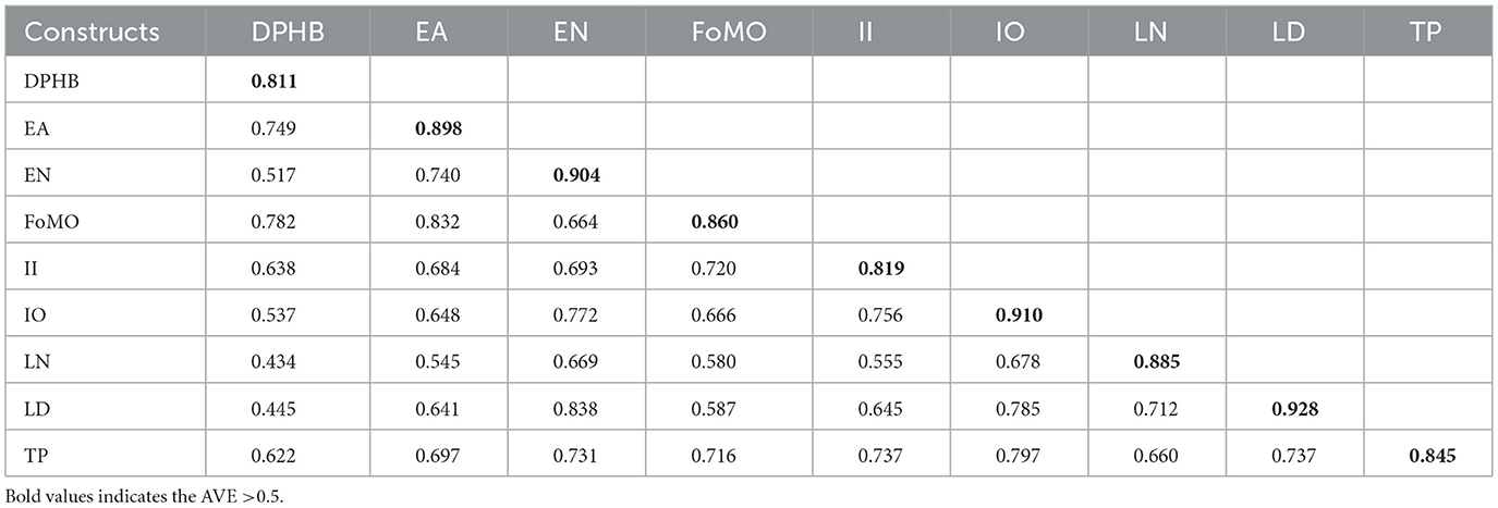 Validity assessment can reveal the effectiveness of a questionnaire. The indicators of measurement validity include convergent validity and discriminant validity. Convergent validity is measured by the Average Variance Extracted (AVE). When the AVE is >0.5, it indicates good convergent validity (Zaremohzzabieh et al., 2024). Discriminant validity can be measured using the Fornell-Larcker Criterion and cross-loadings. As shown in Table 2, the values on the diagonal represent the square root of the AVE for each variable; the squared root of the AVE for each construct is greater than its correlation coefficients with other constructs. The item loadings of each construct are significantly higher than the cross-loadings of other constructs (Due to space constraints, the cross-loadings are not attached and can be requested from the authors upon request.). Therefore, the questionnaire has good discriminant validity.