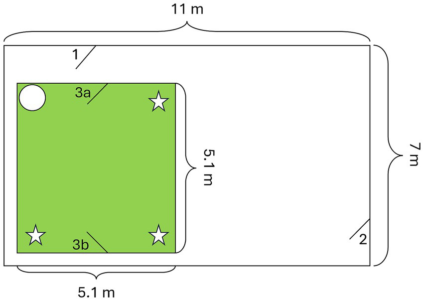 Figure 2. Layout of the testing room (green square). The potential food locations, hanging from the ceiling at a height of 170 cm, are marked with stars, and the circle indicates the position of a chair. (1) & (2) Entrances to the enclosure, entrance (1) was used by the dogs and their owners. (3a) The dogs and their owners entered and left the room through this door. (3b) The experimenter entered and left the room through this door.