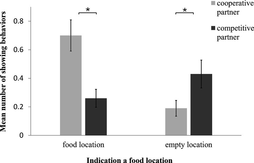 Figure 4. Mean number of showing behaviors over all sessions towards a potential food location in the presence of the cooperative vs. competitive partner. The dogs indicated the food location more often in the presence of the cooperative compared to the competitive partner. However, they indicated an empty food location more often to a competitive partner than to a cooperative partner.