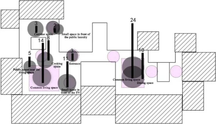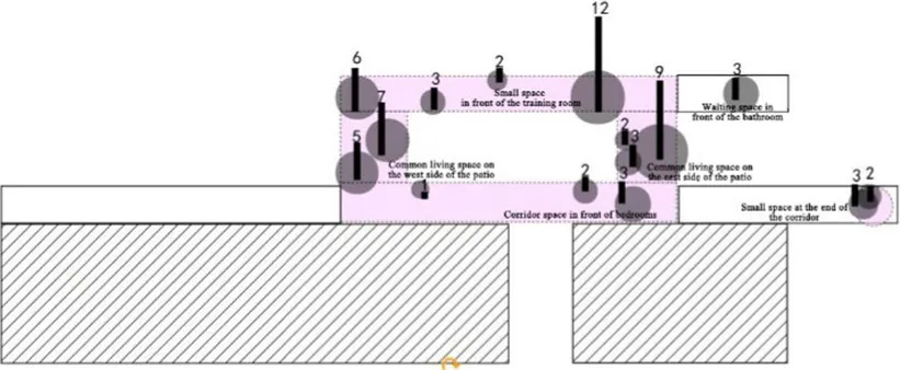The specific research process and quantitative analysis are outlined as follows: The researchers conducted observations of the interaction behaviors exhibited by older adults residents in a nursing home over a total period of 3 days. Observations were carried out daily from 8:00 a.m. to 12:00 p.m., and again from 2:00 p.m. to 9:00 p.m. During these observation periods, the researchers systematically recorded the spatial locations where interactions occurred at fixed intervals of every 10 min on an architectural floor plan. This approach yielded one behavioral observation sample per interval. These samples were subsequently superimposed and plotted onto the architectural plan of the nursing home (Table 3), while simultaneous quantitative analyses were performed (Table 4). As illustrated in Table 3, the pink areas on the architectural floor plan denote spaces designated for interactions within the nursing home; conversely, the gray circular regions represent areas where interaction behaviors among residents occurred, derived from overlaying and mapping out observed behavior samples. Additionally, numerical indicators have been included to reflect the frequency of these interaction behaviors among older adults individuals.