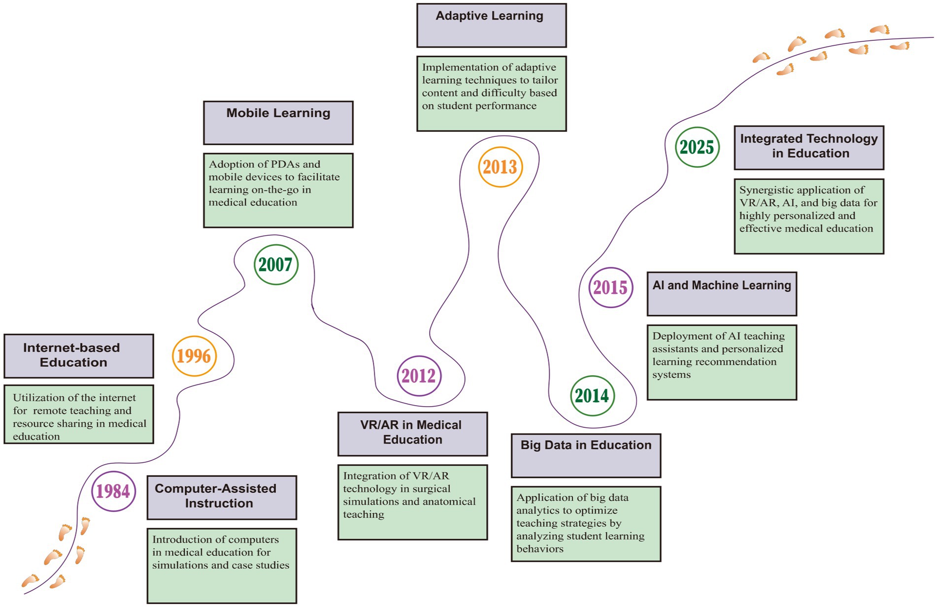 In charting the evolution of medical educational technology, from its nascent phase to the current digital revolution, a clear trajectory of technological progress is evident (Lamb et al., 2023; Rachel et al., 2015). This advancement not only chronicles the transformation of pedagogical methods but also signals the direction of future developments (Figure 1). At the forefront of medical education, a field crucial for developing the medical professionals of tomorrow, we stand at a critical juncture in traditional teaching paradigms, confronting the pressing need for innovation in personalized instruction, enhanced student engagement, and improved knowledge assimilation (Mohammed and Fahad, 2025). Amidst the rapidly advancing technological landscape, characterized by computational power, algorithms, and data, humanity has entered the fourth industrial revolution, heralding a golden era for the integration of cutting-edge educational technologies into medical education (Richard and Friedman, 1984). This heralds not only a significant paradigm shift in medical education but also holds profound implications for the future of the healthcare industry at large.