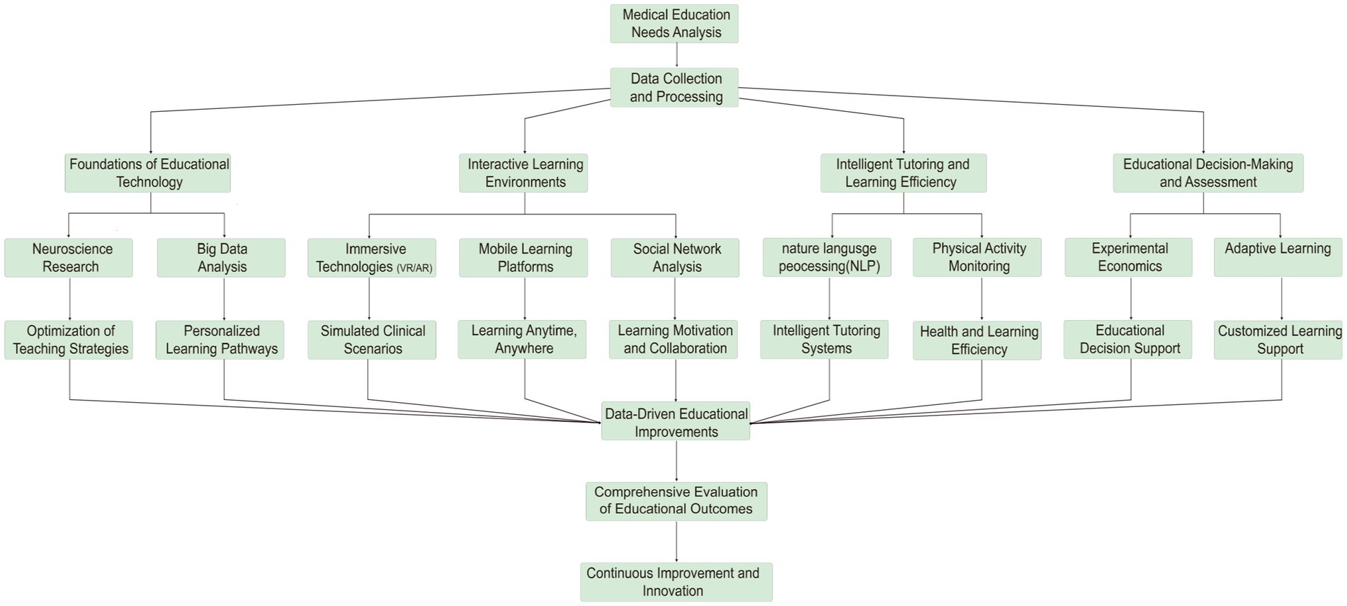 The integration of advanced technologies in medical education has been a transformative force, as underscored by the foundational contributions of neuroscience strategies (Carew and Magsamen, 2010) and personalized learning. These technologies have enabled interactive learning environments, such as immersive technologies and mobile learning, which have enhanced intelligent tutoring and learning efficiency. The data and tools provided by these advancements have facilitated educational decision-making and assessment, leading to a continuous optimization of educational practices and policy evaluation through data-driven improvements. This progression illustrates a logical evolution from basic research to practical application, and from decision-making to refinement, forming a cyclical optimization logic (Figure 2).